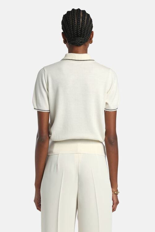 Поло з вовняної тканини гладкого в'язання зі смугастими деталями, прикрашеними люрексовими нитками, з короткими рукавами, нагрудною кишенею з ребристого в'язання та геральдичними ґудзиками «LS».