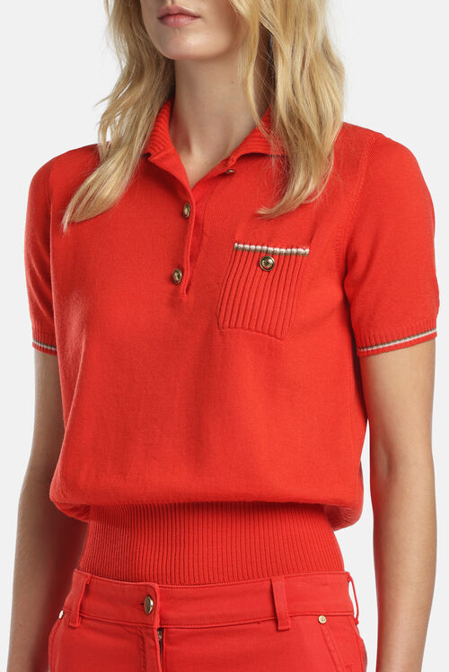 Поло з вовняної тканини гладкого в'язання зі смугастими деталями, прикрашеними люрексовими нитками, з короткими рукавами, нагрудною кишенею з ребристого в'язання та геральдичними ґудзиками «LS».