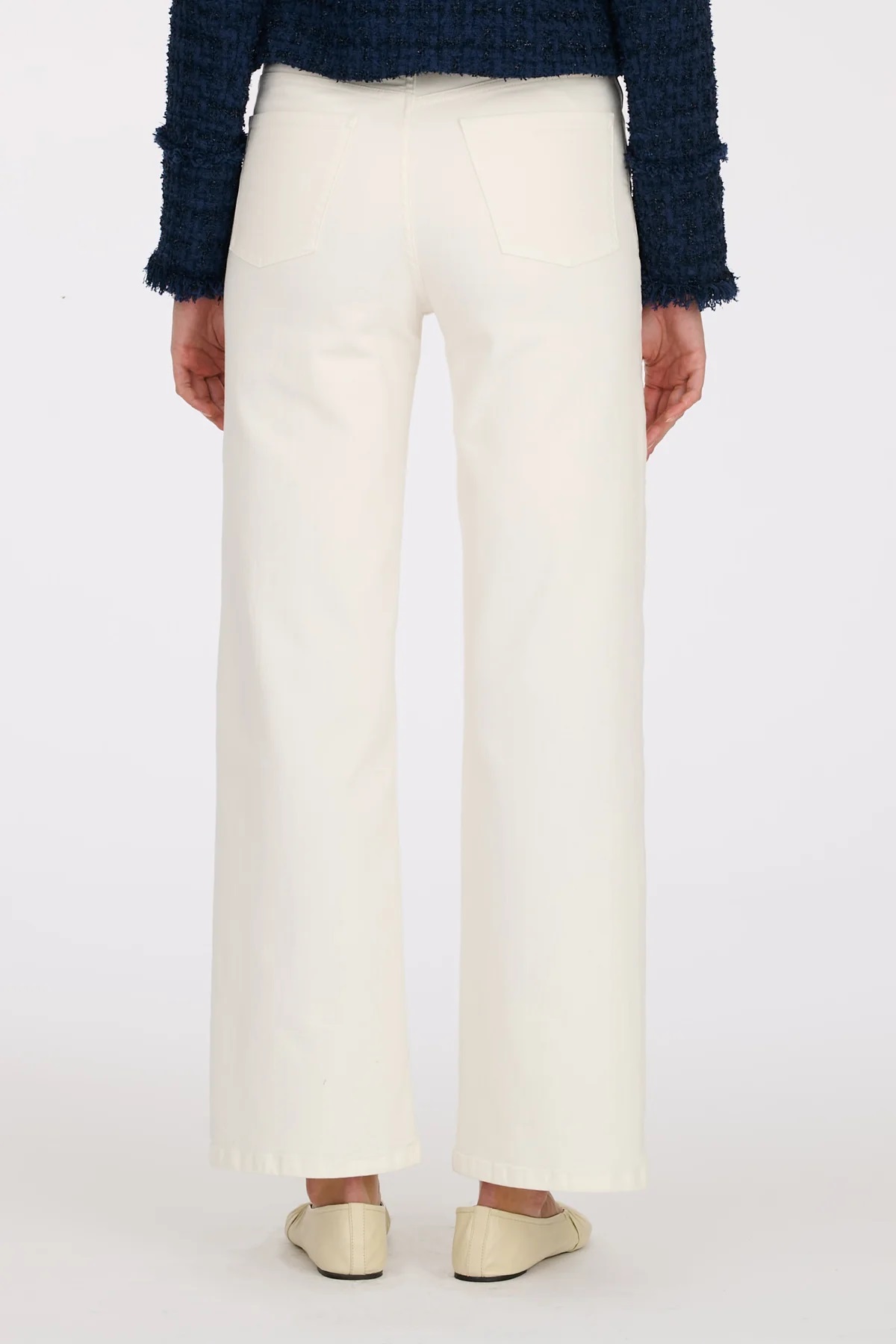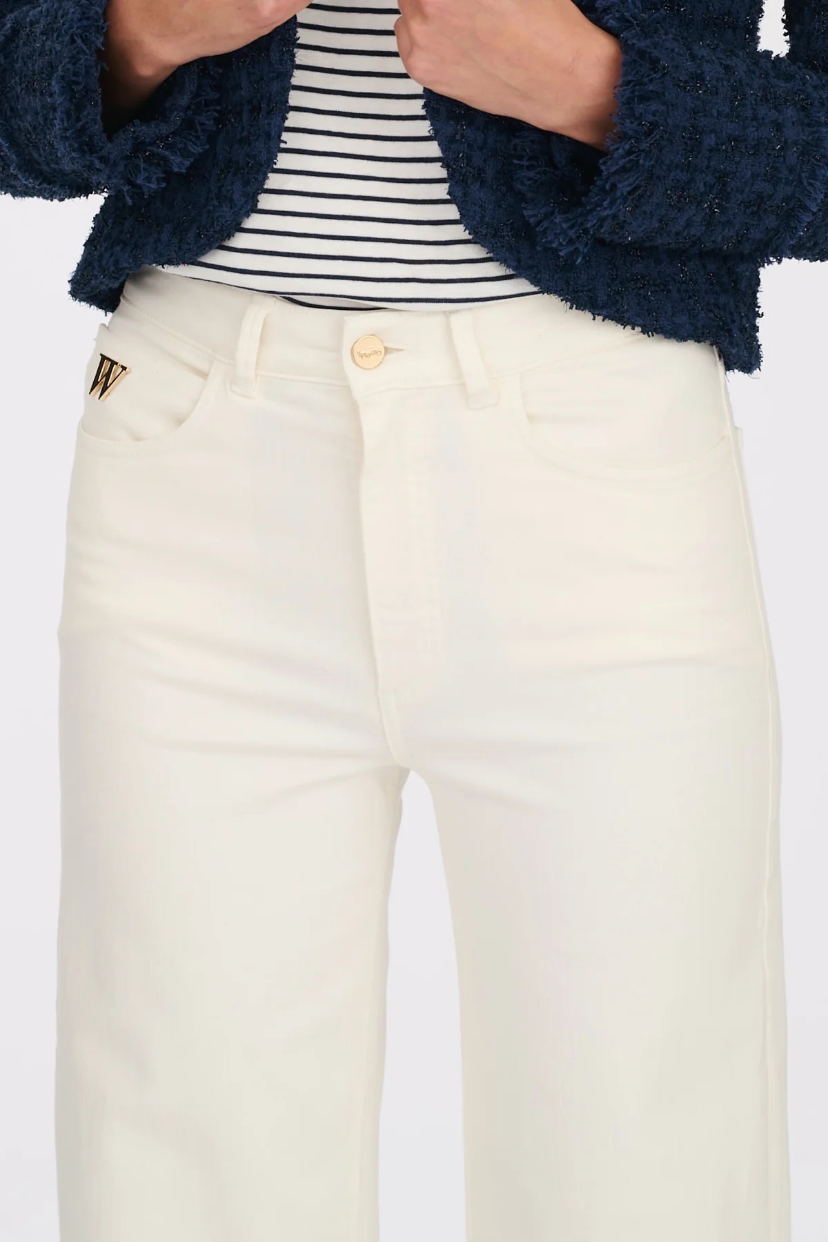Джинси широкого крою з п'ятьма кишенями. Модель має високу талію, петлі для ременя, застібку-блискавку під клапаном.