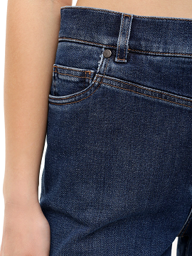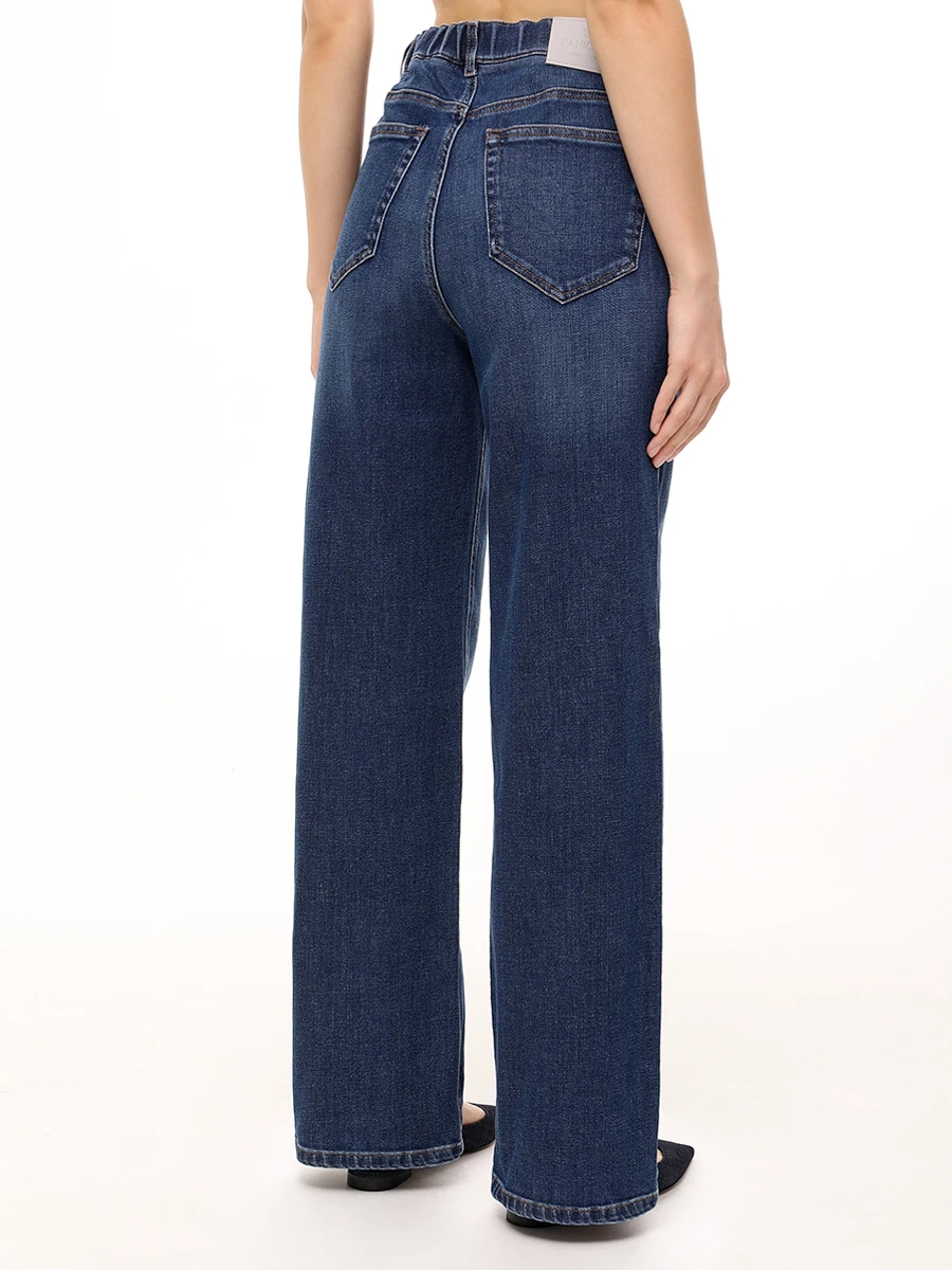 Джинси прямого крою темно-синього кольору. Вони мають високу посадку та класичний дизайн із п'ятьма кишенями. Вони мають легкий ефект вицвітання та акуратні шви. Застібаються на ґудзик і блискавку та мають пояс на резинці.