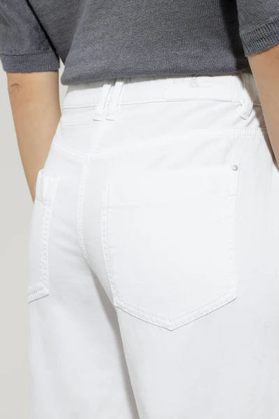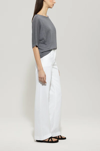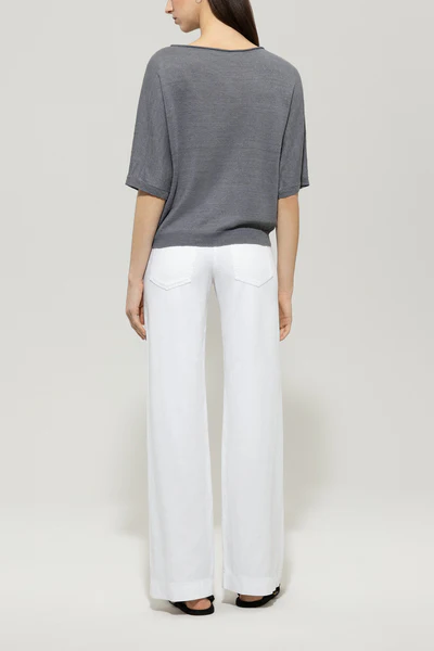 Широкі джинси з високоякісного бавовняно-лляного деніму з петлями для ременя. Мають класичний дизайн з п'ятьма кишенями та застібаються на декоративний ґудзик і блискавку.
