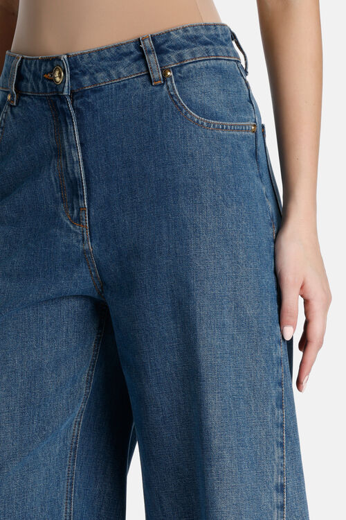 Джинсові штани кльош з 5 кишенями. Ззаду - перехресні петлі для ременя, внизу - незашитий необроблений край. Звичайна посадка.