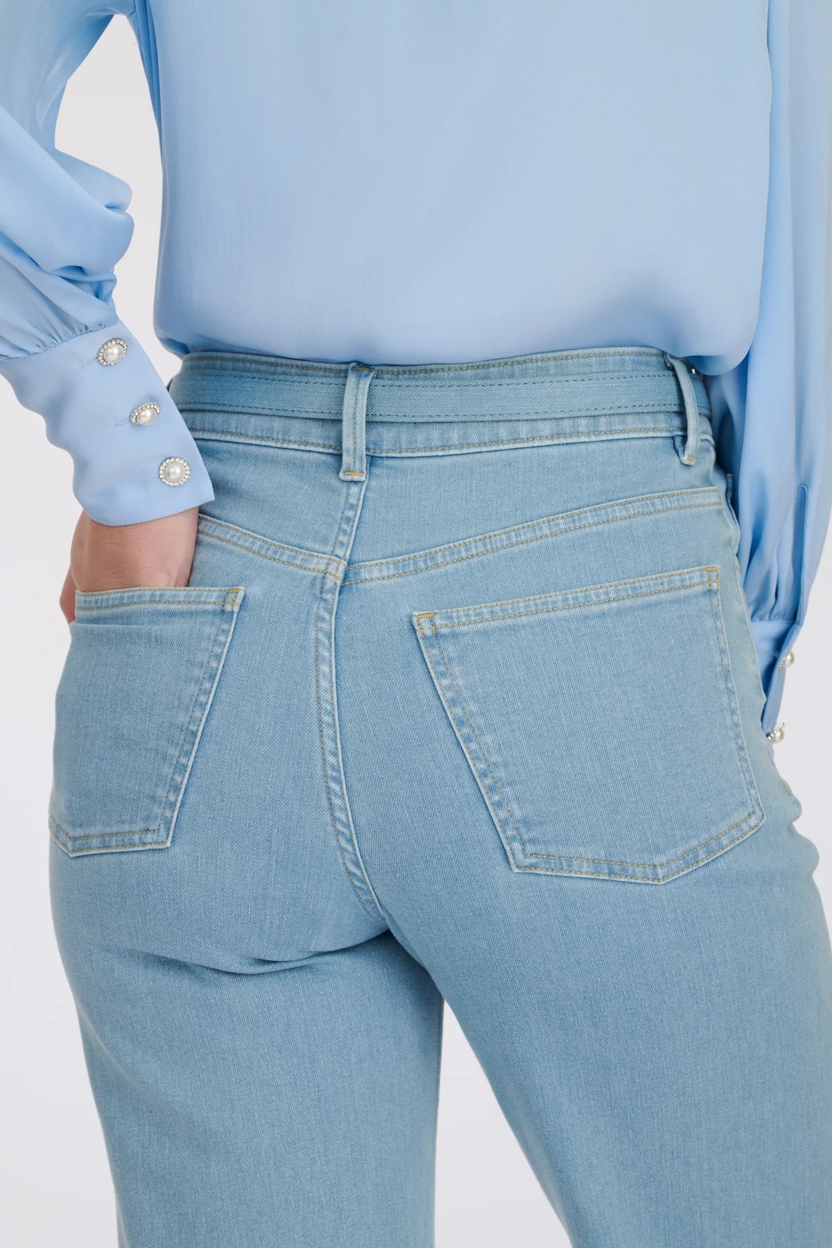 Джинси широкого прямого крою. Мають 5 кишень, петлі для ременя. Застібка-блискавка під клапаном. Індивідуальна застібка на ґудзики Weill на поясі. Дана модель має високу талію.