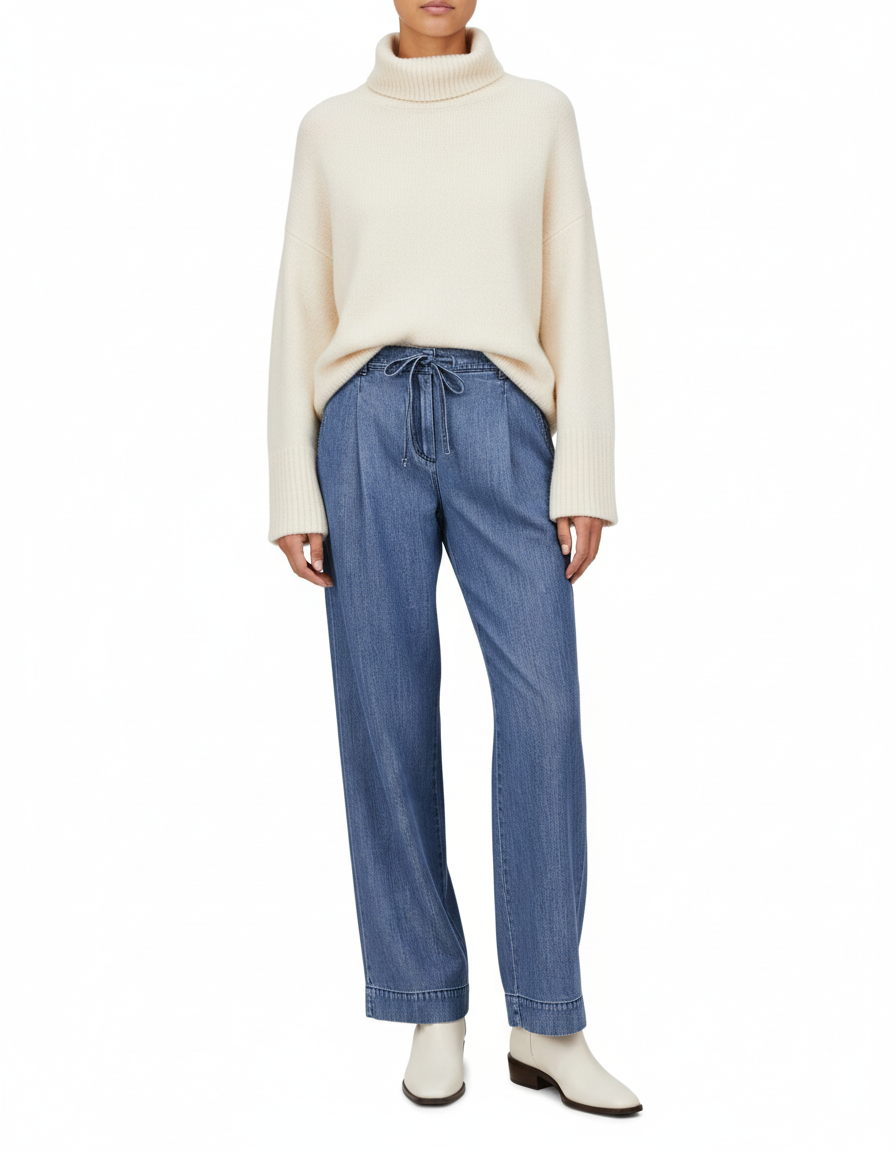 Модель має комфортну високу посадку на талії та еластичний пояс із зав’язками, завдяки чому легко регулюється обхват і забезпечується максимальна зручність під час носіння. Вільний прямий крій штанин створює легкість силуету та підходить для різних типів фігури.