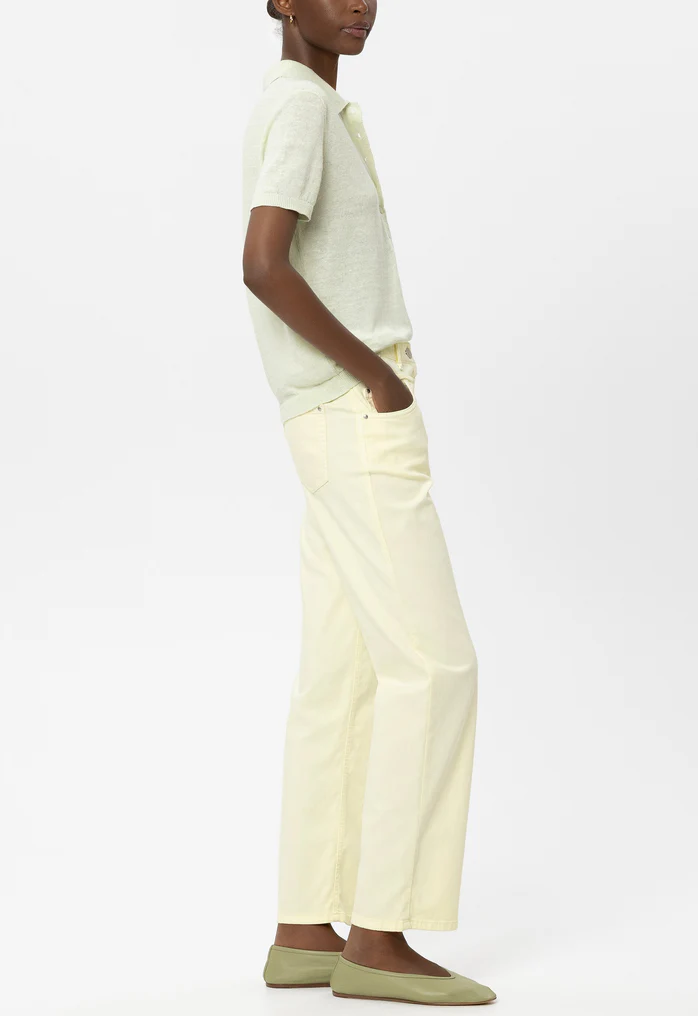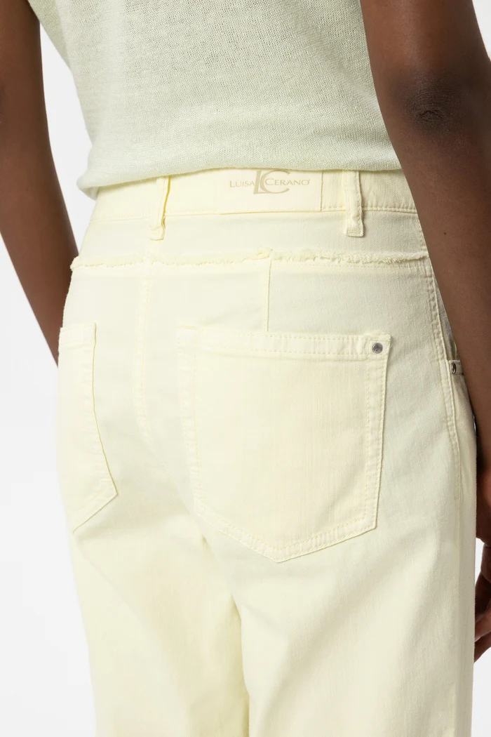 Джинси прямого крою з легкого кольорового деніму зі стрейч-ефектом. Візуальним акцентом штанів є шов з бахромою, що створює враження подвійного пояса.