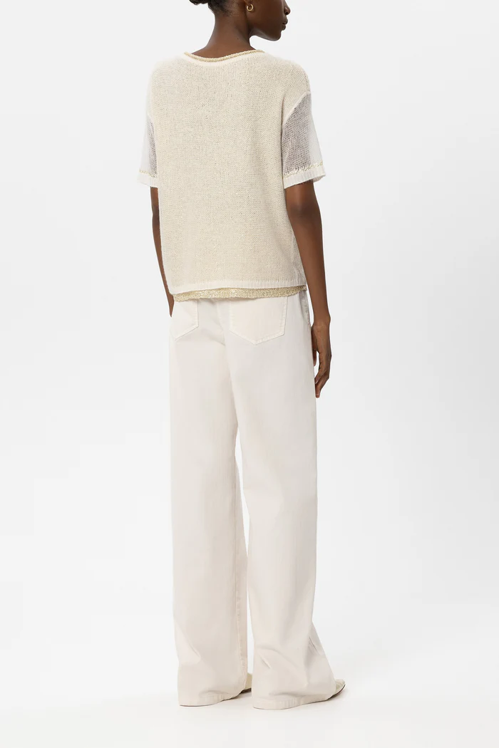 Джинси з широкими штанинами, виготовлені з легкого кольорового деніму зі стрейчем. Ці брюки вирізняються незвичайними деталями, такими як дві передні кишені з клапанами та декоративними металевими ґудзиками, а також вигідною для фігури прострочкою ззаду.
