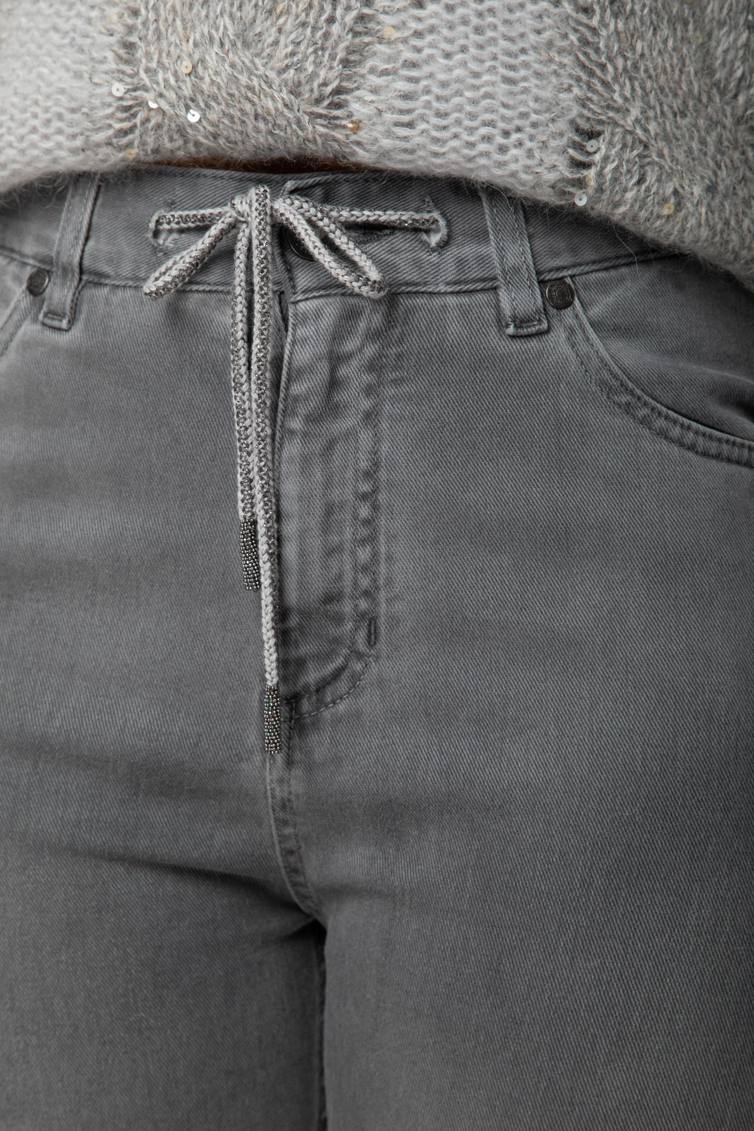 М’який денім із ефектом легкого зістарення забезпечує комфорт і бездоганну посадку. Модель із середньою талією, еластичним поясом на шнурівці та прямим силуетом поєднує зручність спортивного стилю з елегантністю італійського дизайну.