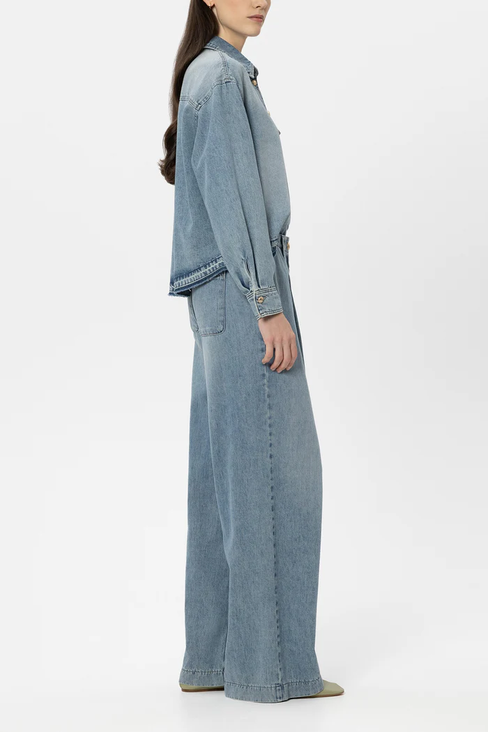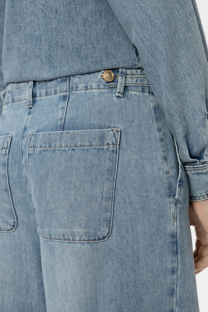 Джинси широкого крою з легкої суміші бавовни та ліоцелю, з чотирма кишенями та складками. На бічній частині пояса розміщені петлі для ґудзиків, які додають стильного акценту.
