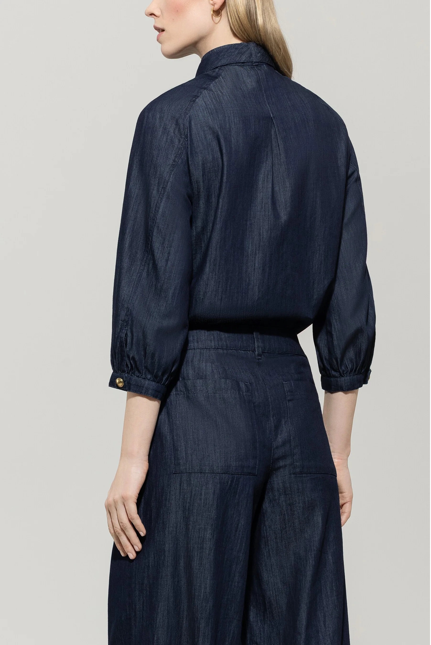 Блуза з легкого деніму, який можна прати, з відрізним клапаном і рукавами довжиною ¾. Декоративні ґудзики золотистого кольору спереду та на манжетах рукавів привертають увагу.