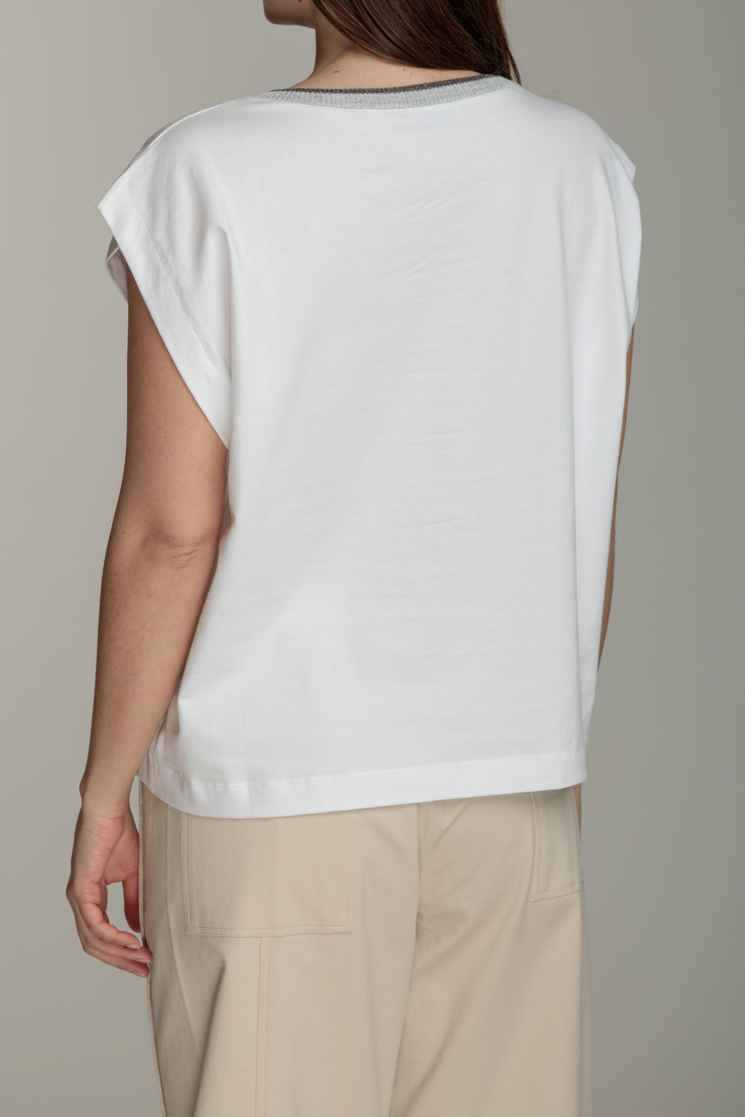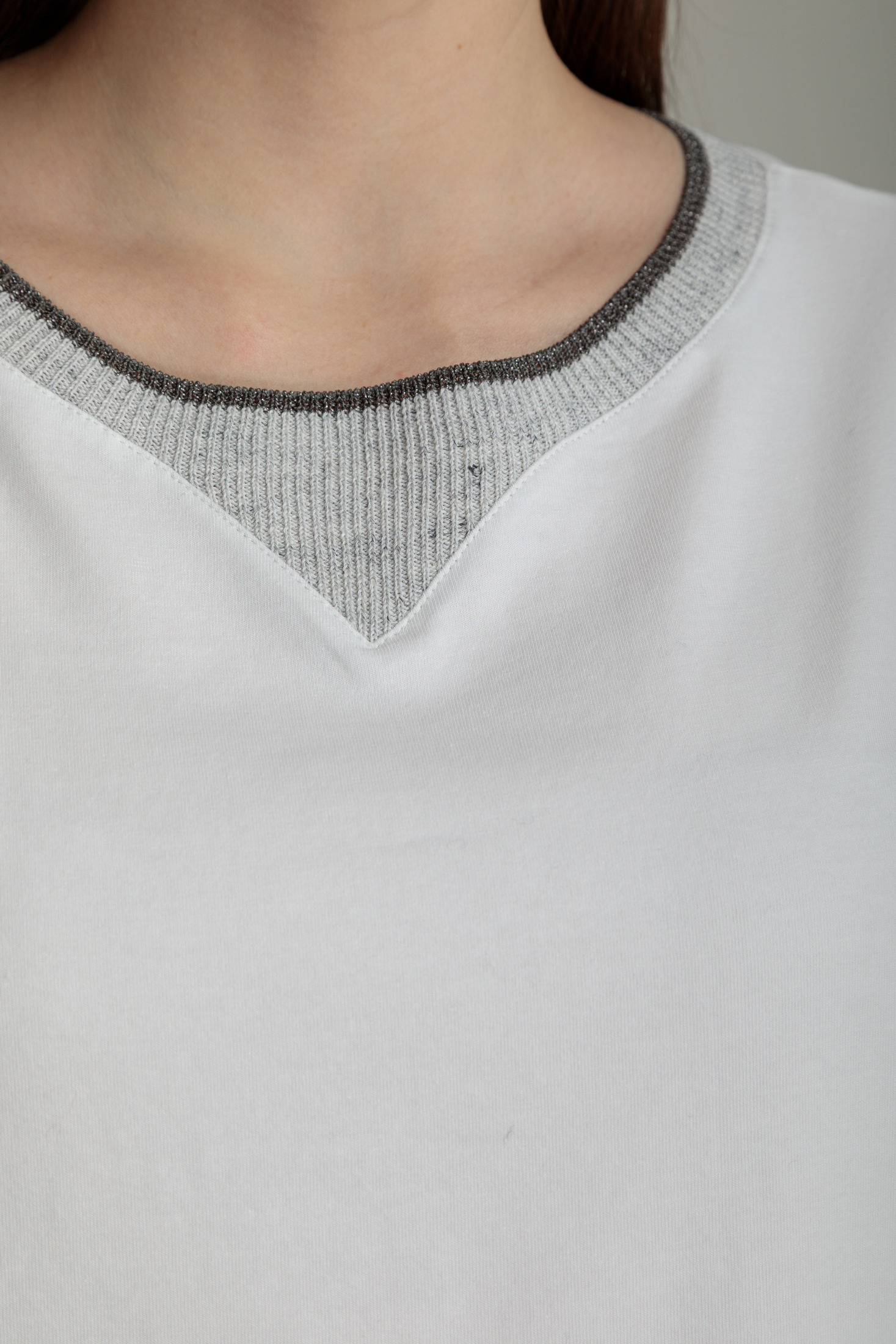 Футболка вільного крою. Вона має круглий виріз горловини, який доповнений декоративною вставкою з фактурної тканини. Така ж трикутна вставка розташована під вирізом, додаючи моделі цікавого акценту.