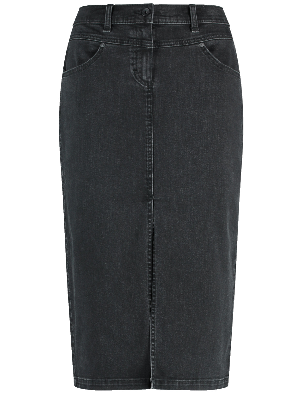 Спідниця з еластичного деніму. Нормальна посадка. Застібається на гудзик та блискавку, має бокові кишені.