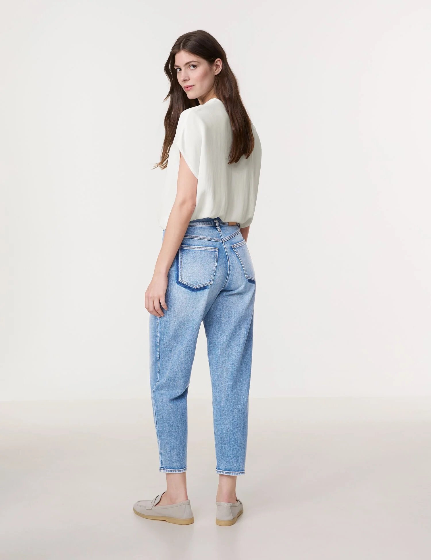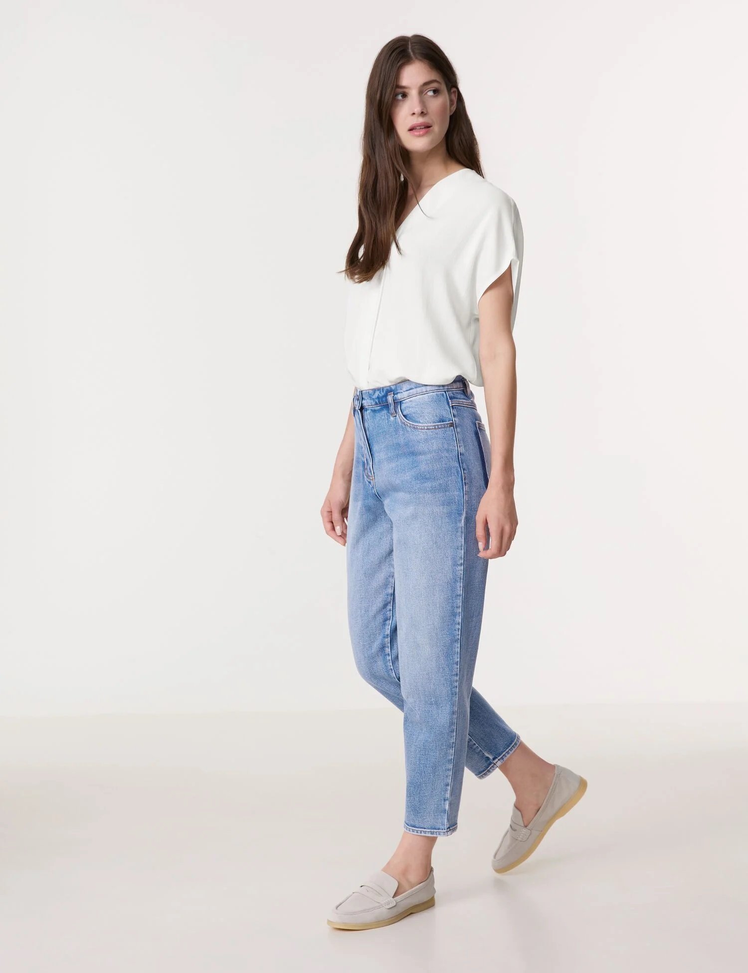 Джинси 7/8 з еластичного деніму із ефектом потертостей. Завищена посадка. Застібаються на гудзик та блискавку.