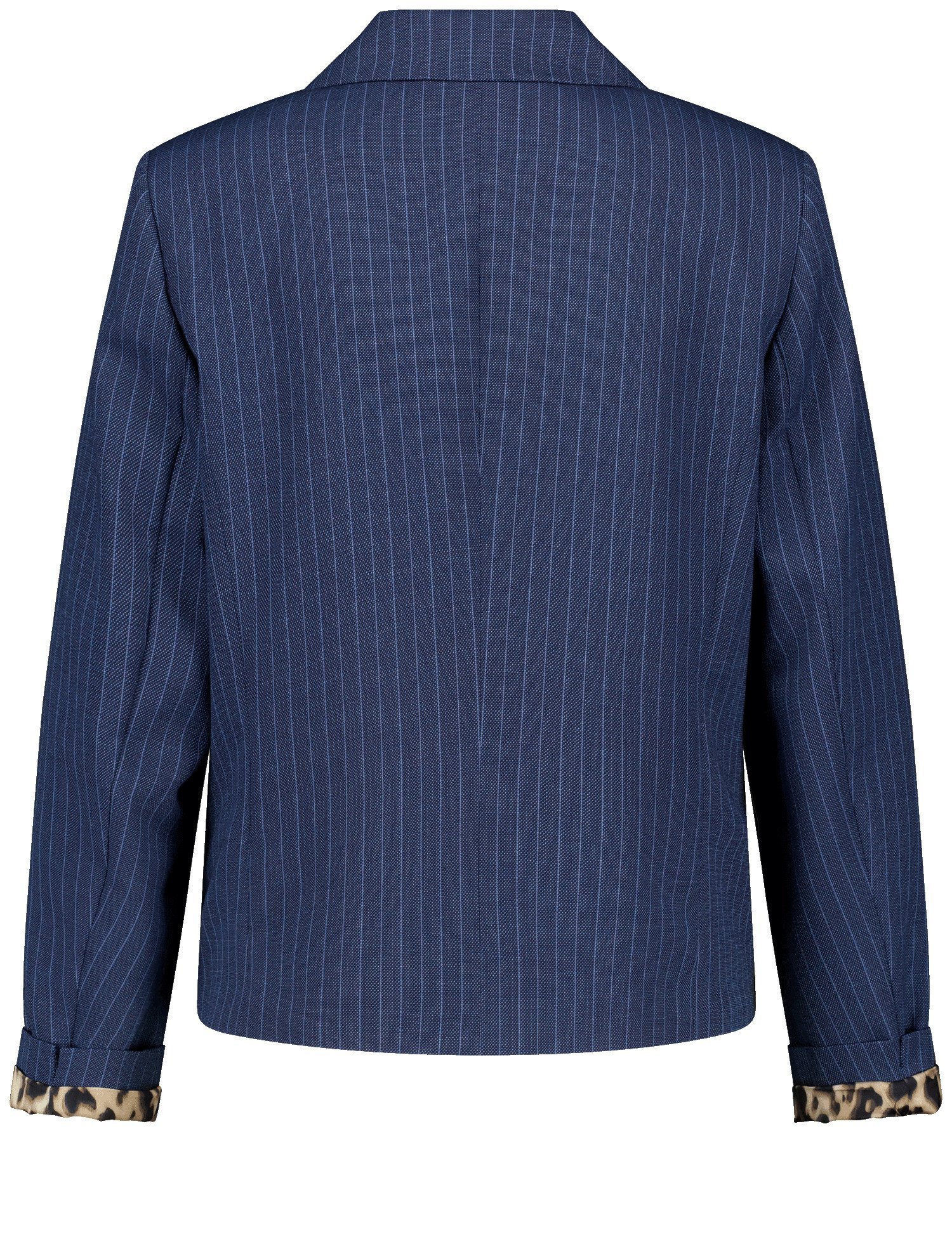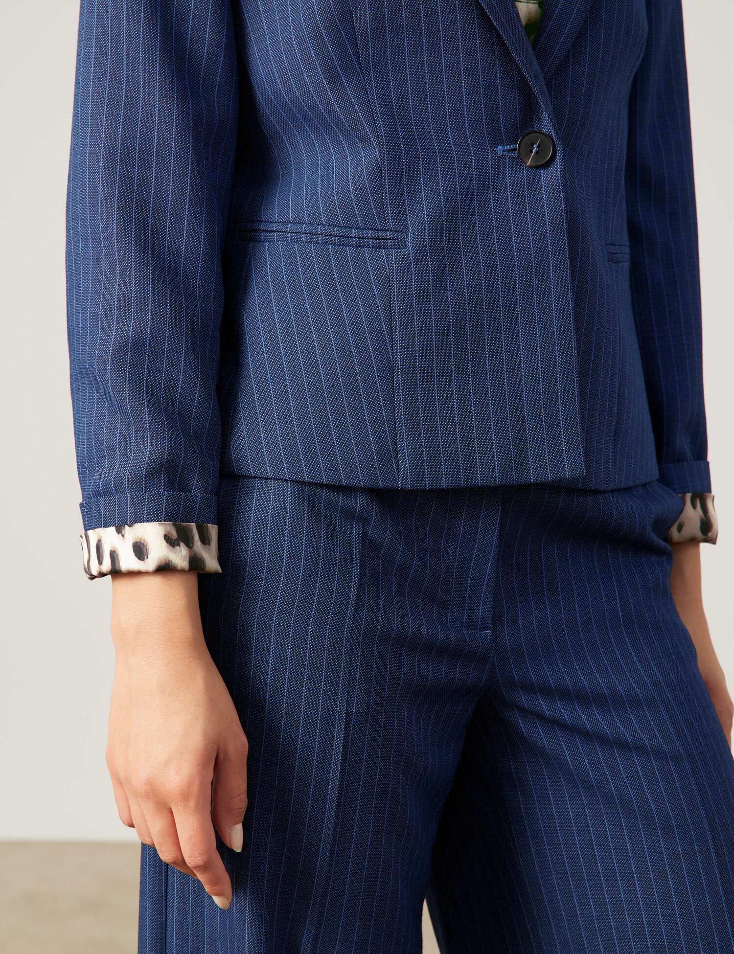 Приталений жакет із тонкими смужками. Має класичний комір, застібається на гудзик спереду.