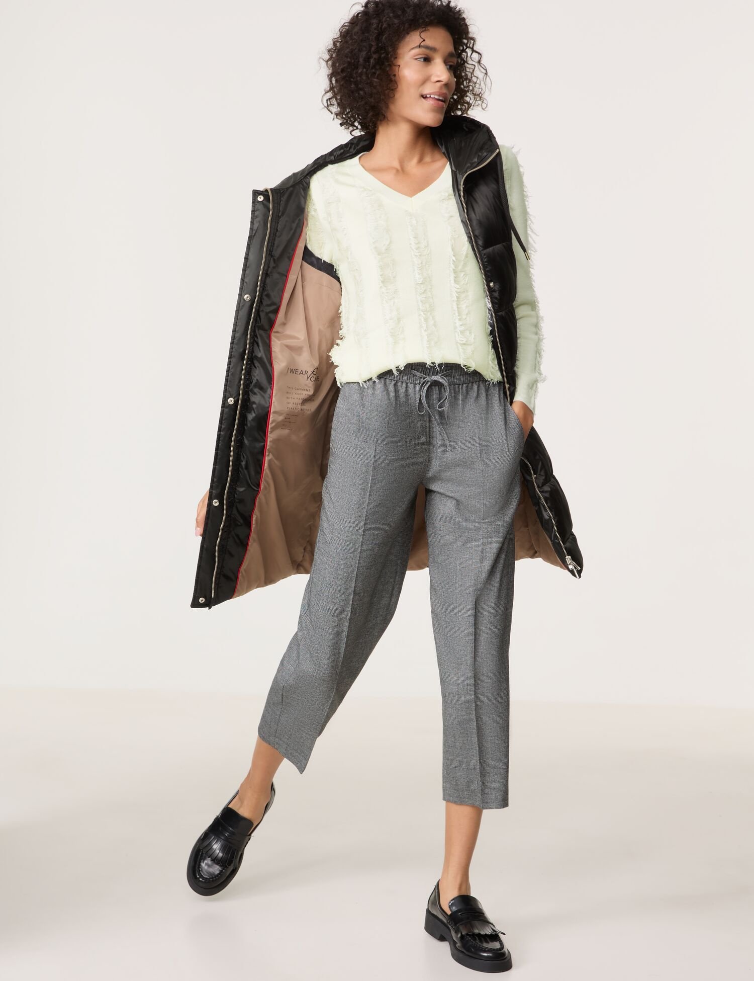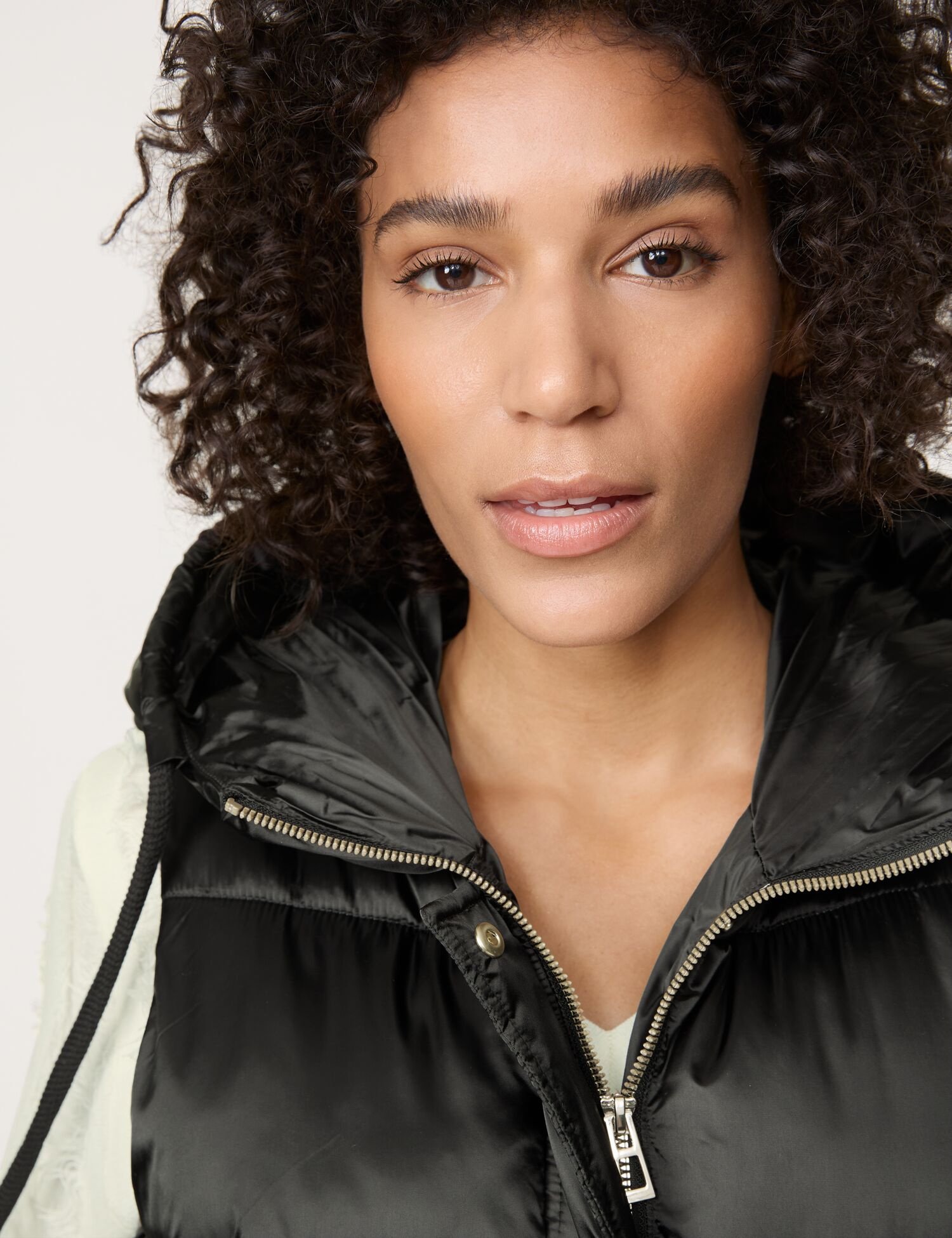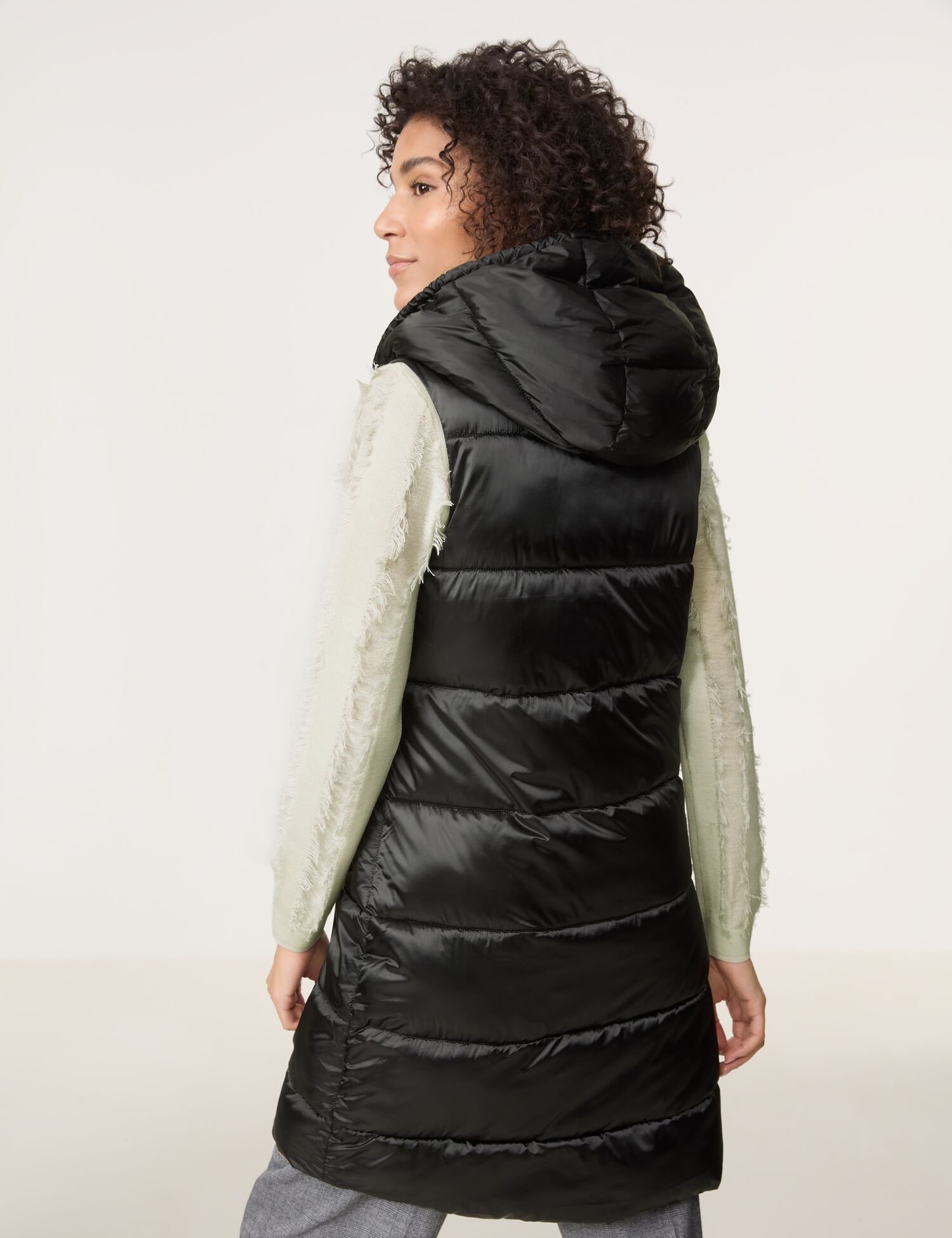 Стьобаний подовжений жилет з капюшоном. Застібається на блискавку, має прорізні кишені спереду, які також застібаються на блискавку.