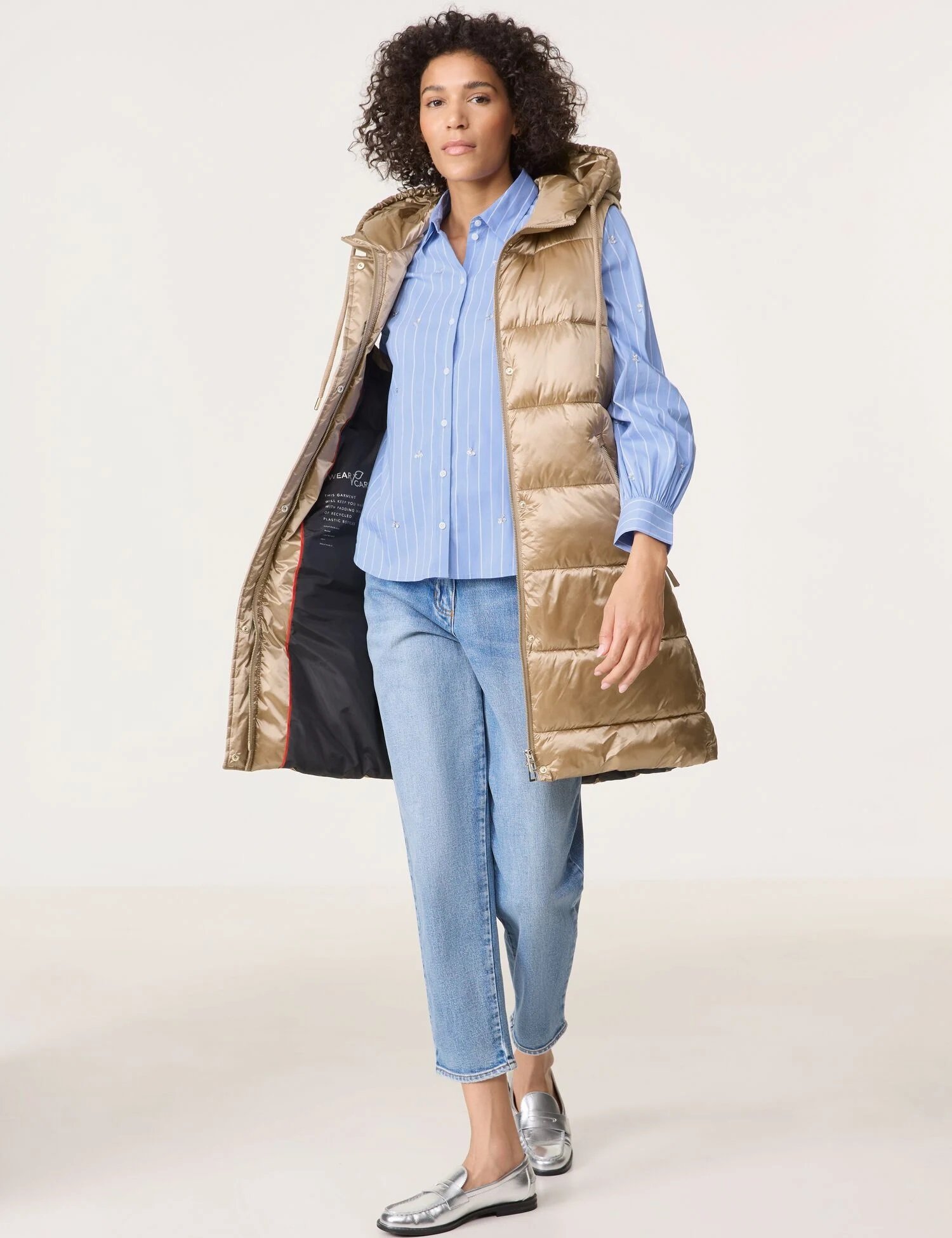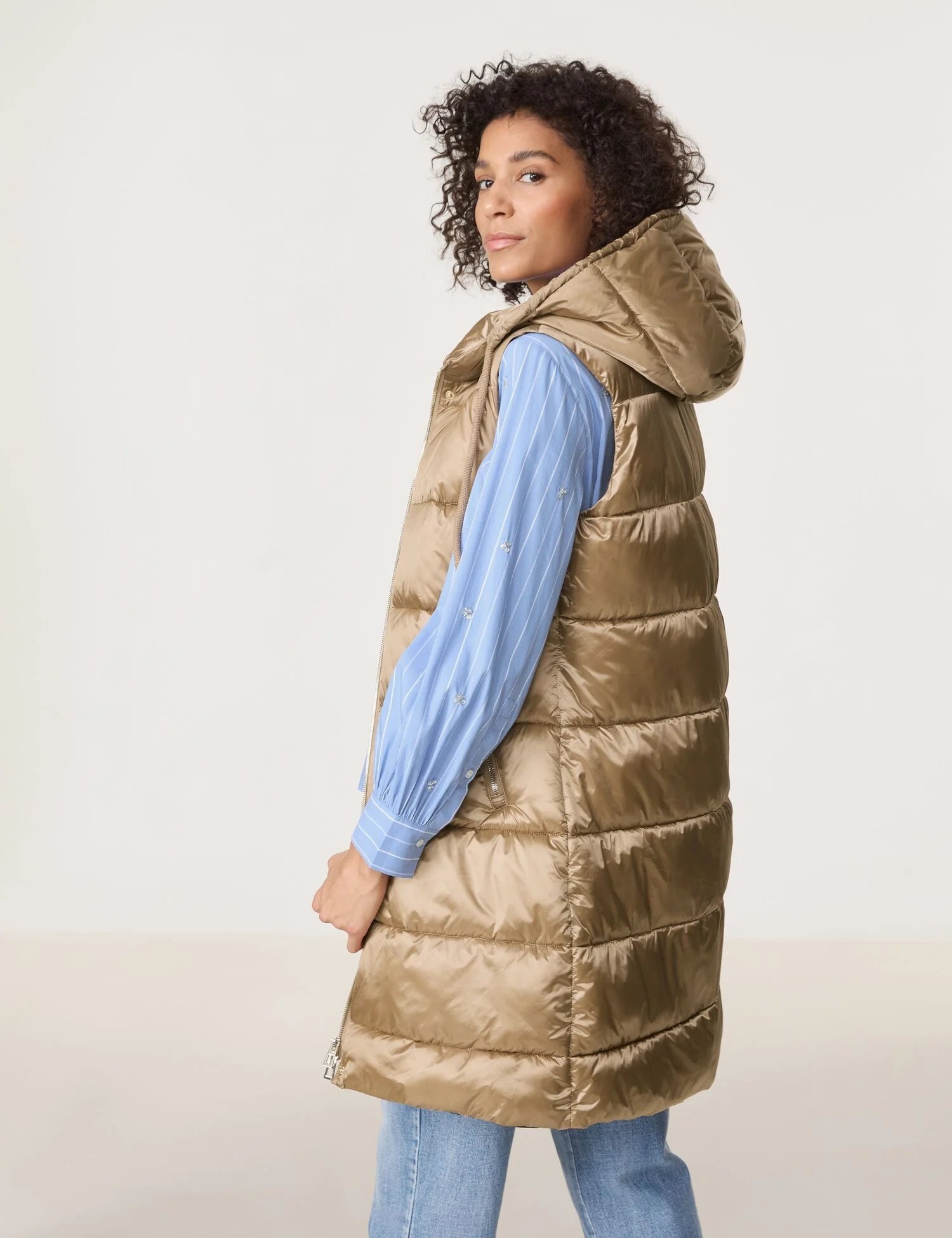 Стьобаний подовжений жилет з капюшоном. Застібається на блискавку, має прорізні кишені спереду, які також застібаються на блискавку.