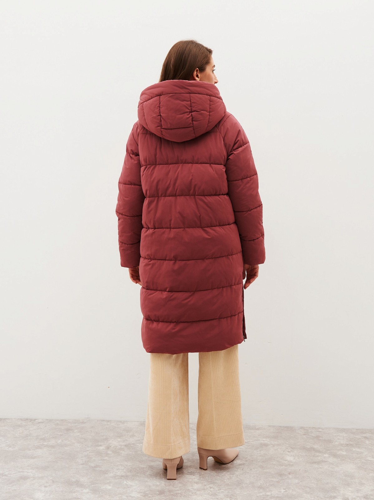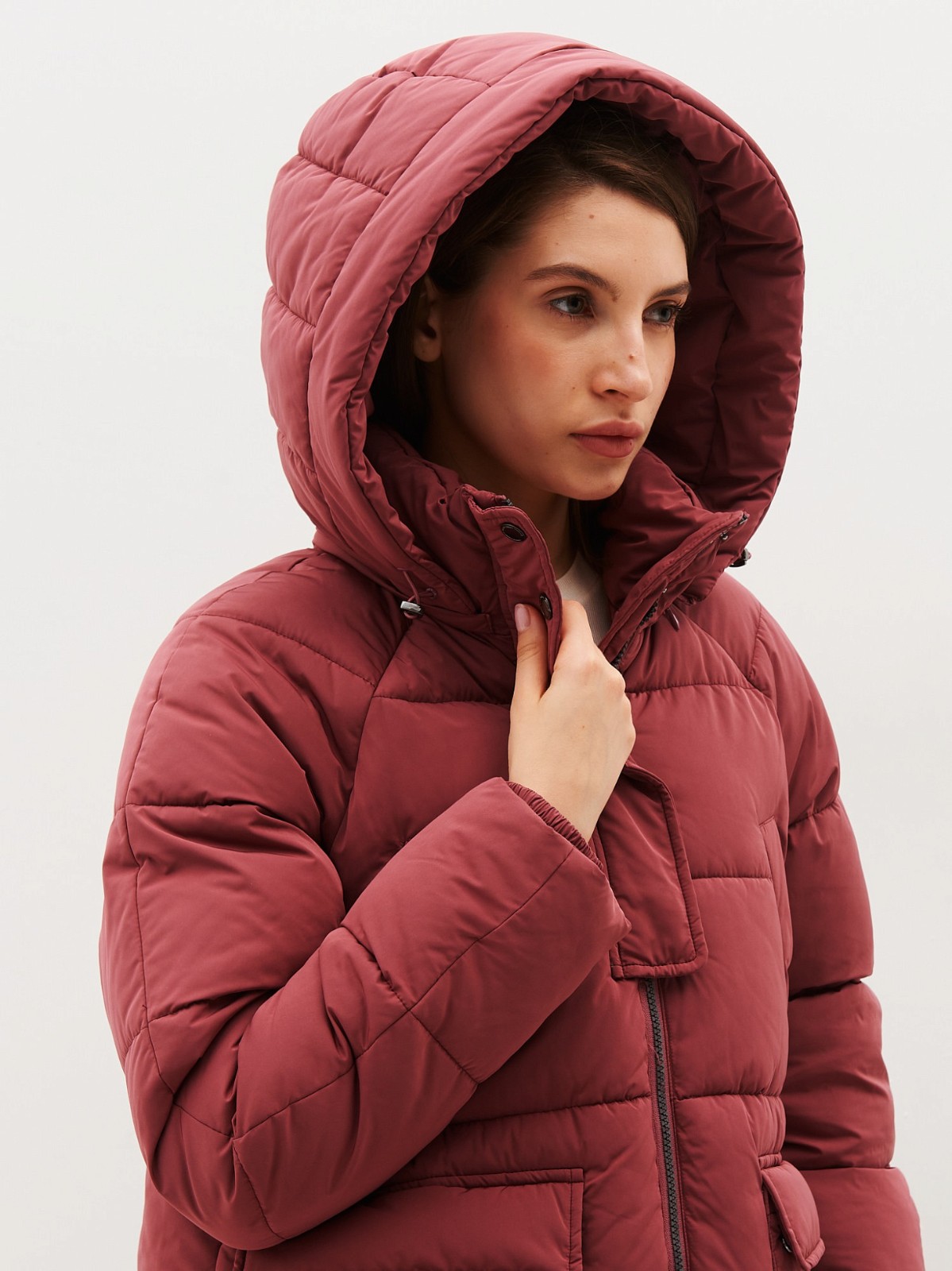 Стьобане пальто з високим коміром та капюшоном. Застібається на блискавку та кнопки. Модель має дві врізні кишені та дві кишені з клапанами попереду.