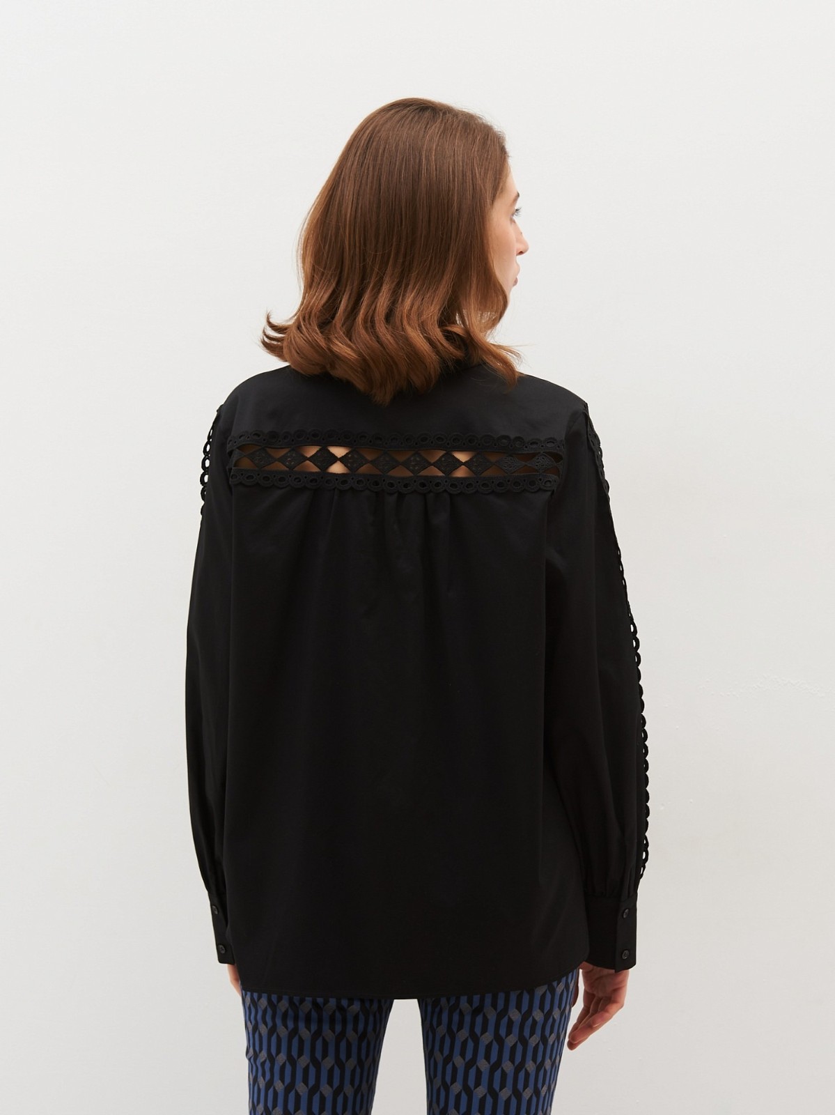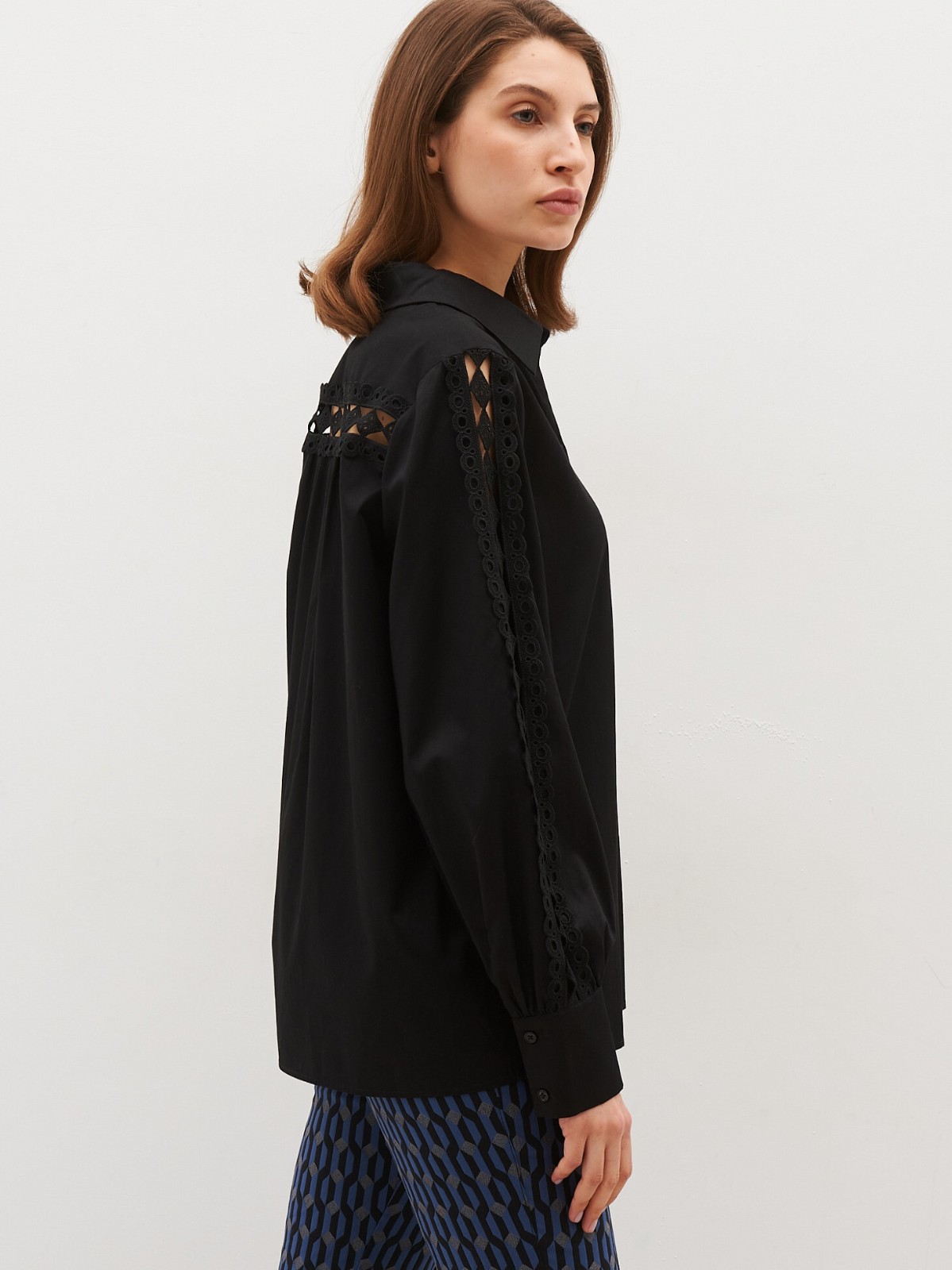 Блуза з бавовни з класичним коміром. Застібається на гудзики. Рукави прикрашені мереживом.