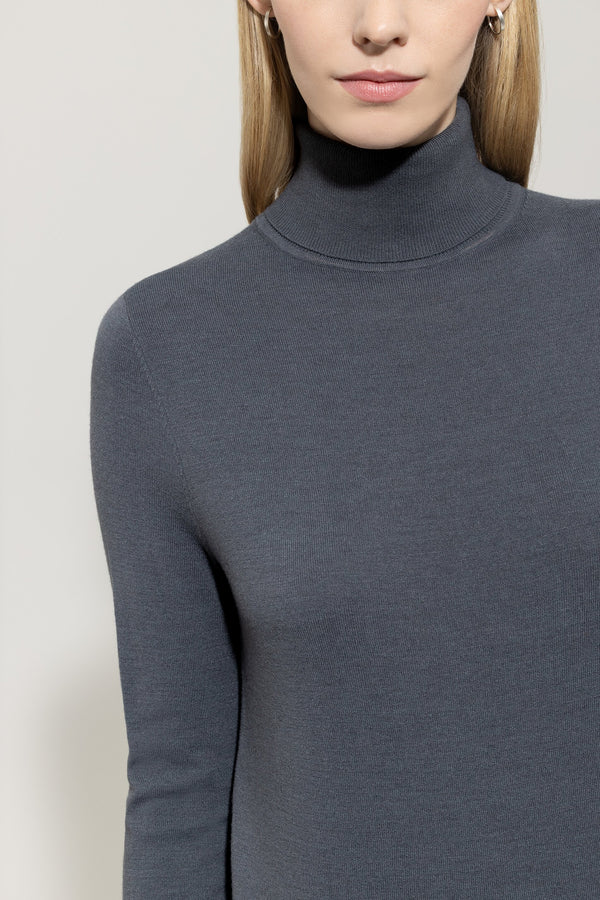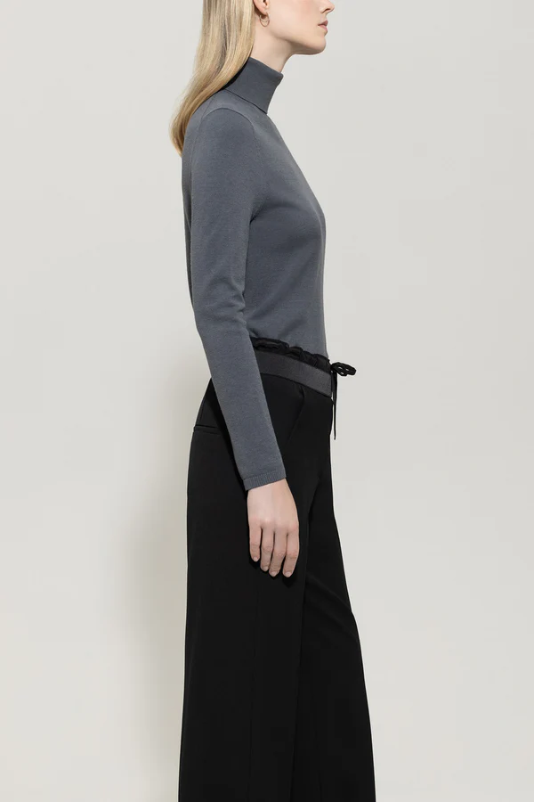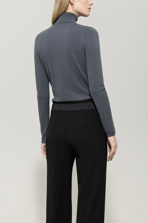 Простий светр з високим коміром, виготовлений з м'якої вовняної суміші. Светр має вільний крій і прикрашений ребристими манжетами.