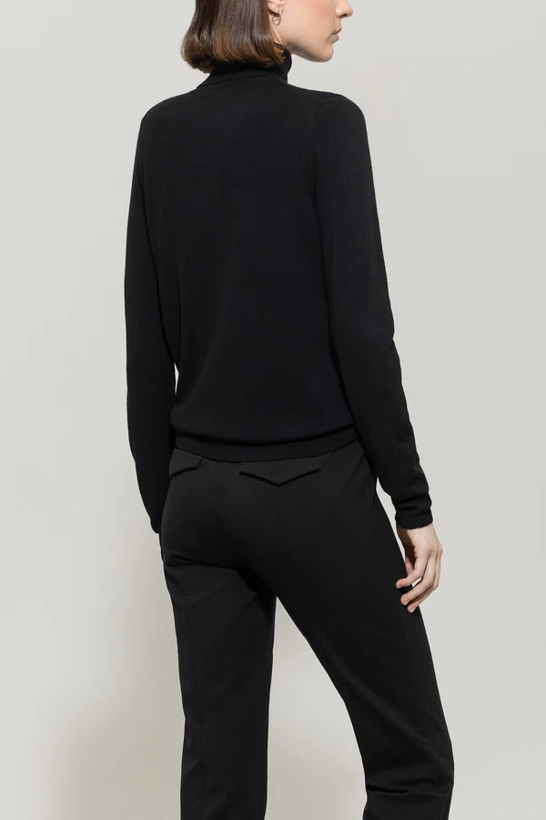 Простий светр з високим коміром, виготовлений з м'якої вовняної суміші. Светр має вільний крій і прикрашений ребристими манжетами.
