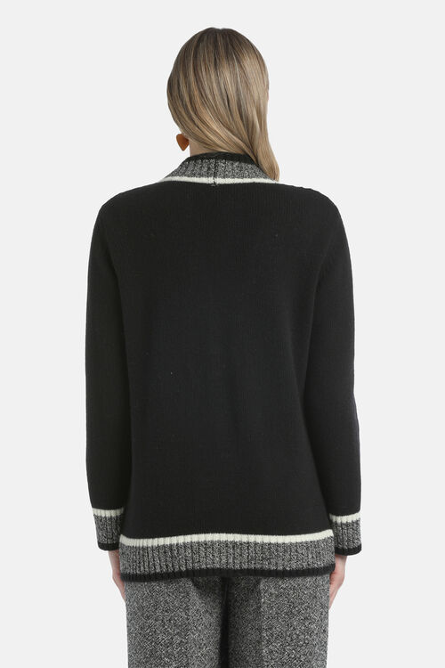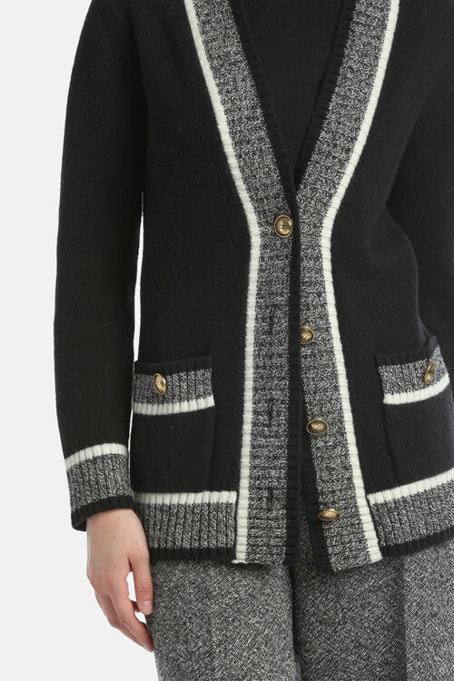 Кардиган з гладкої вовни та кашеміру, з контрастними ребристими краями. Модель прикрашена старовинними золотистими геральдичними ґудзиками «LS» та накладними кишенями. Класичний крій.