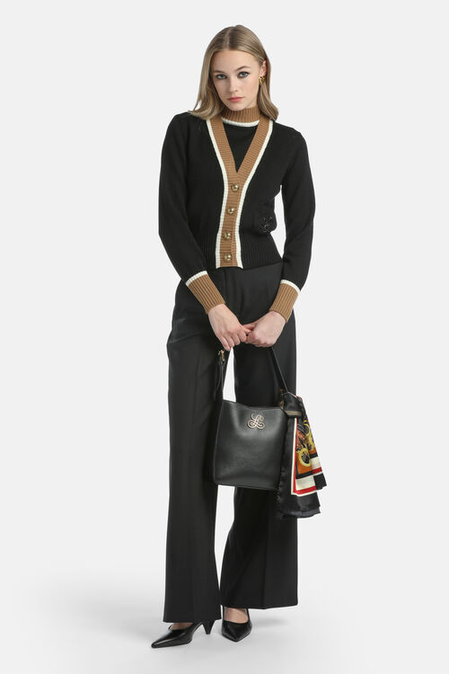 Кардиган з натуральної вовни з контрастними смужками. Оздоблений золотистими геральдичними ґудзиками «LS» та вишивкою «LS» курсивом на нагрудній кишені. Класичний крій.