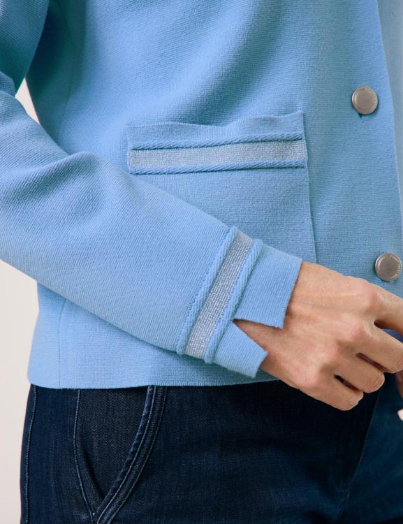 Кардиган має відкладний комір і застібається на три декоративні ґудзики сріблястого відтінку. Кардиган оснащений двома накладними кишенями з декоративними вставками, які додають йому стильного вигляду. Такі ж вставки присутні на манжетах рукавів, підкреслюючи загальний дизайн моделі.