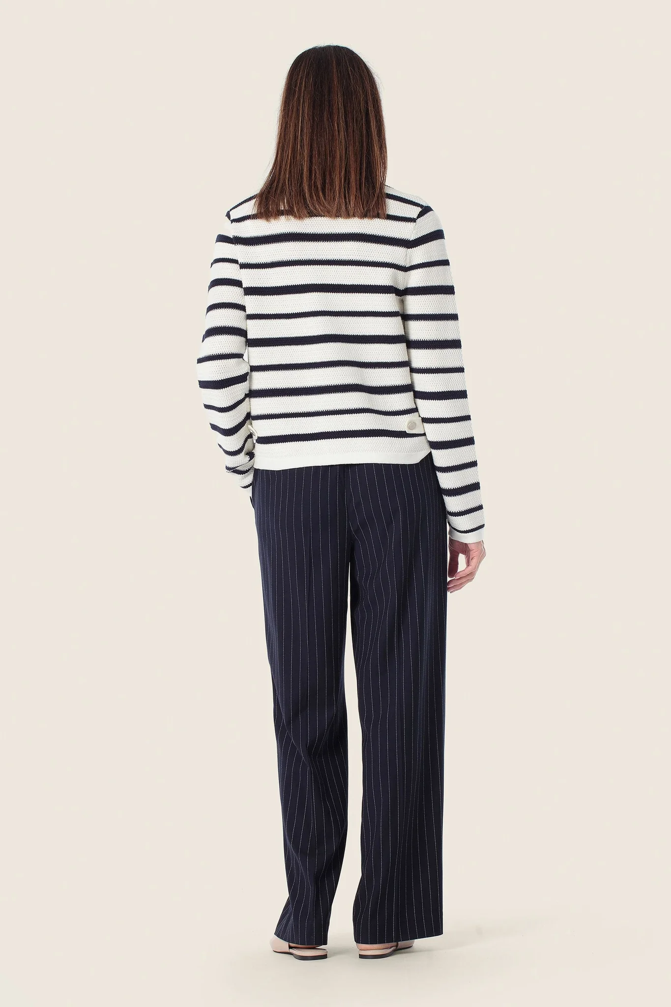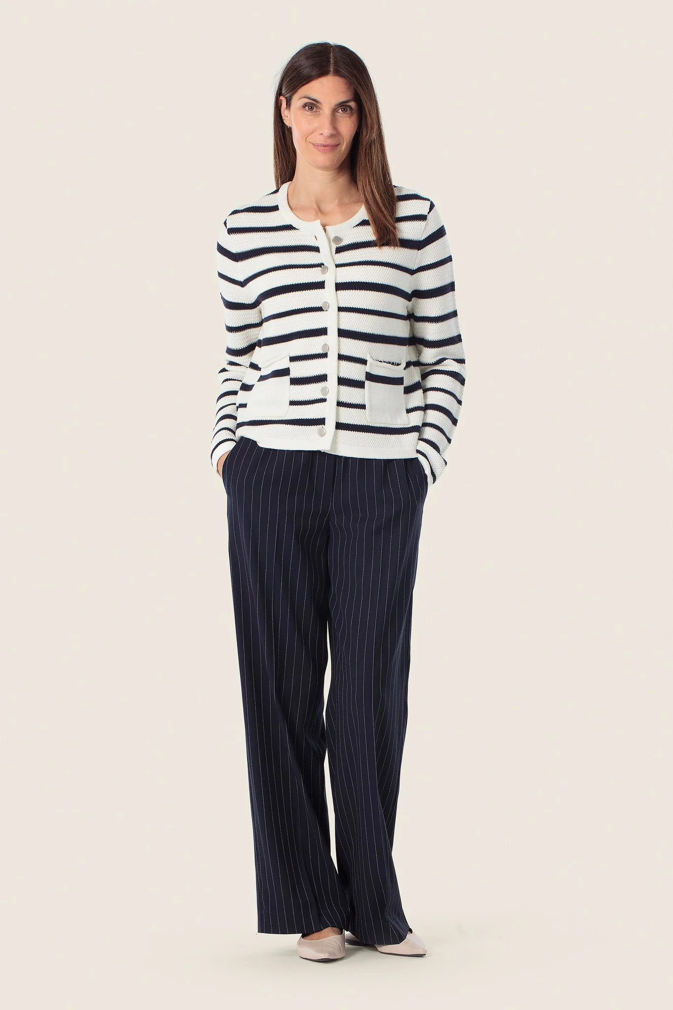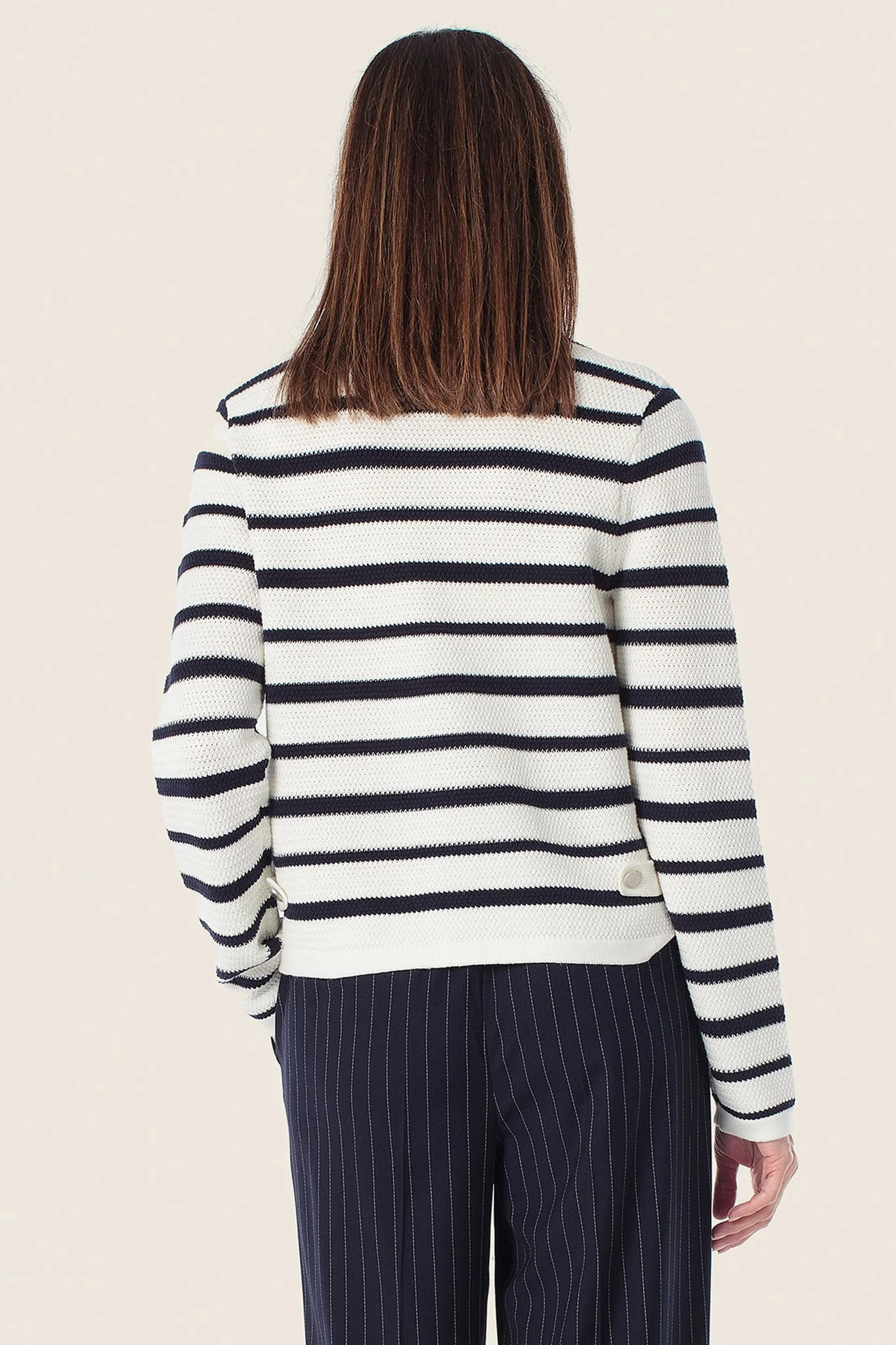 Кардиган у контрастну смужку — стильна інтерпретація морської класики. М’який трикотаж приємний до тіла, прямий силует забезпечує комфортну посадку, а застібка на ґудзики додає акуратності образу.