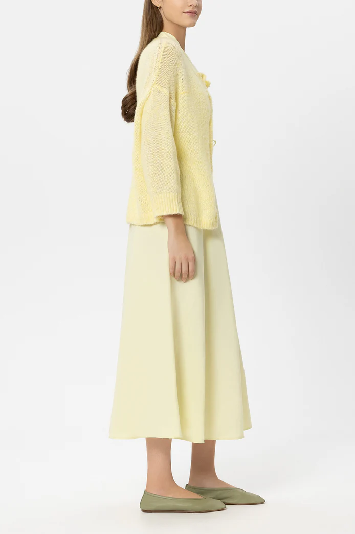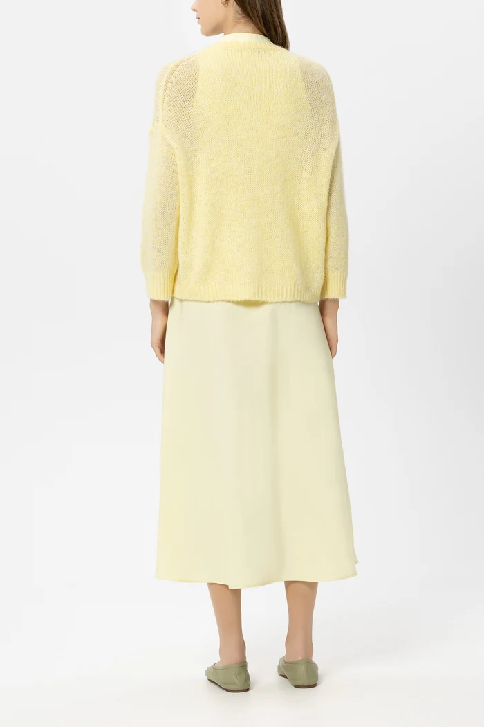 Кардиган прямого крою з суміші альпаки та вовни, з круглим вирізом, опущеними плечима та застібкою на ґудзики по всій довжині. Завдяки технології «airspun» пряжа є особливо легкою, м’якою та пухнастою.