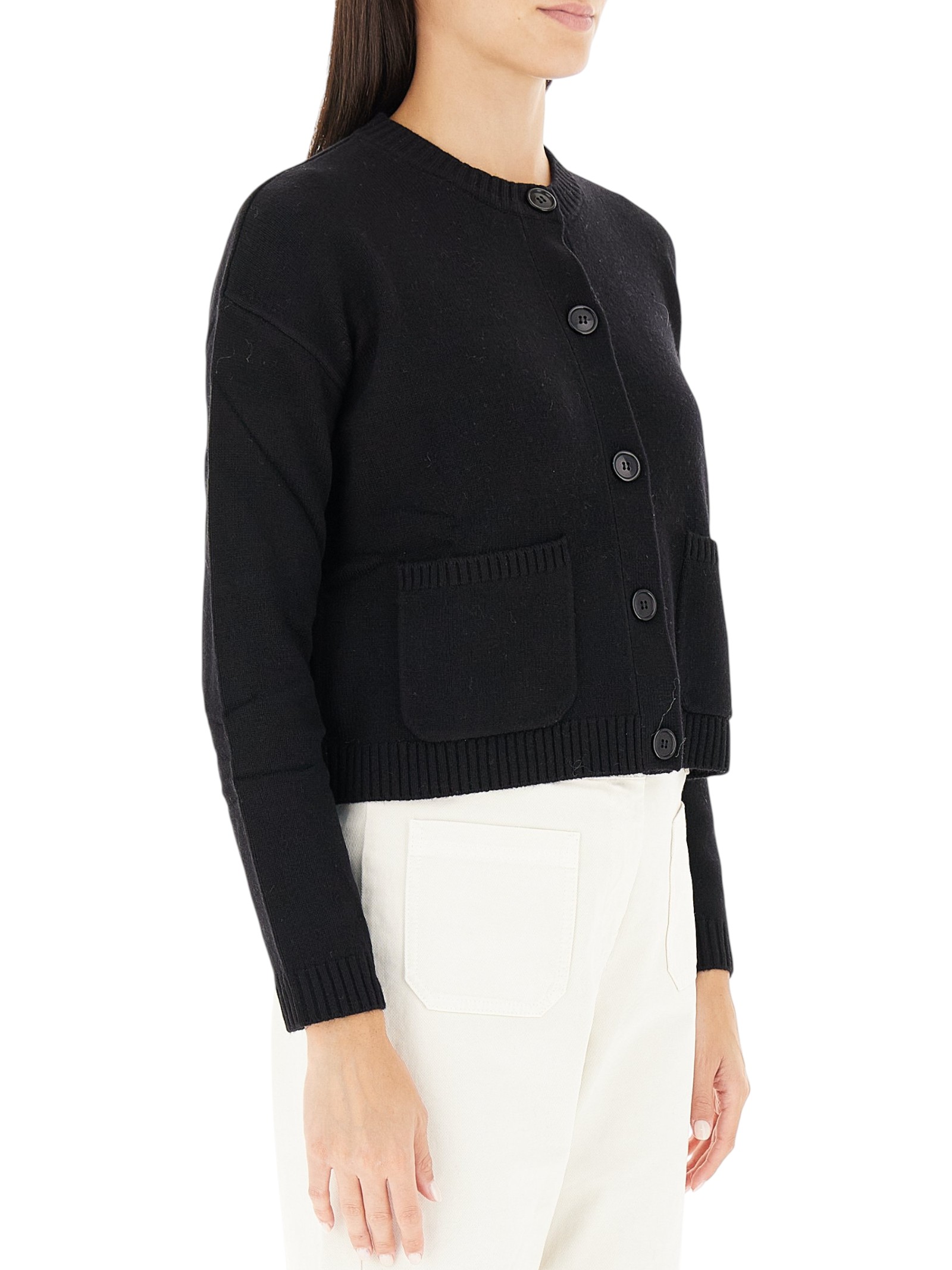 М’який вовняний кардиган з класичним круглим вирізом і застібкою на ґудзики. Модель має спущену лінію плеча, акуратні накладні кишені та еластичну обробку по краях, що додає комфорту.