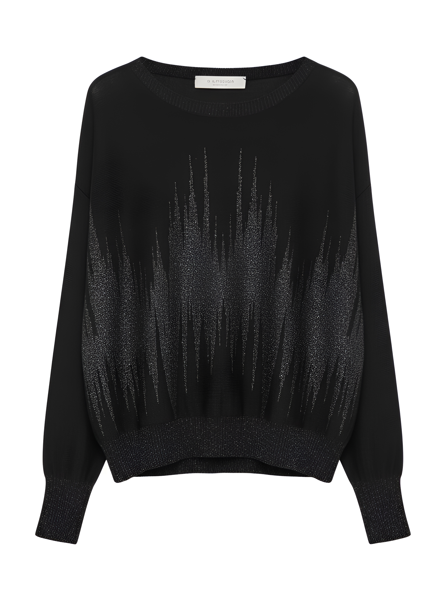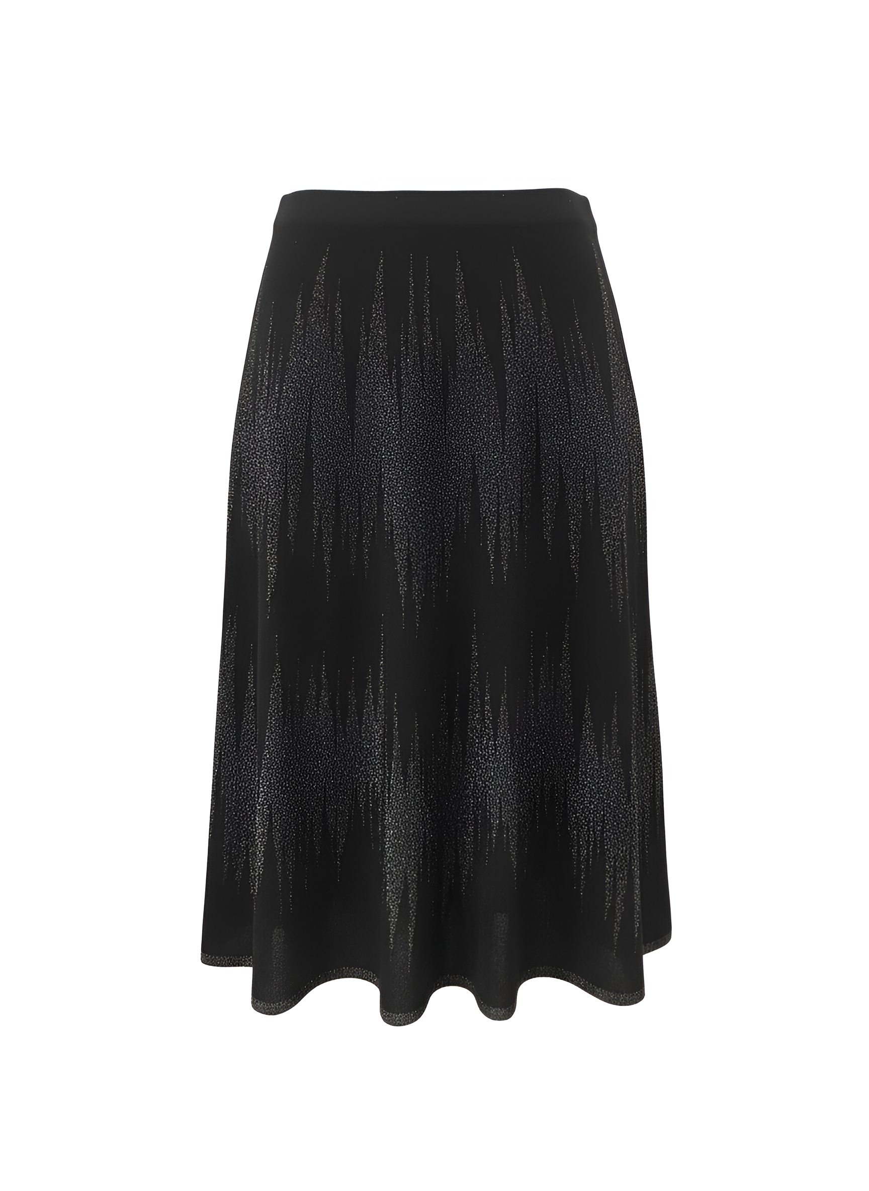 Костюм складається з в’язаного джемпера і спідниці міді, виконаних у глибокому чорному кольорі з геометричним блискучим візерунком. Лаконічний круглий виріз додає витонченості, а легкий мерехтливий акцент створює ефект вишуканого вечірнього образу.