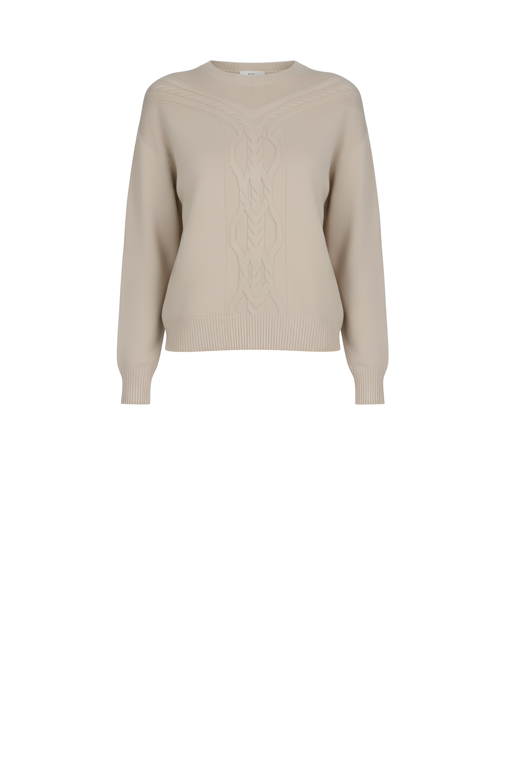 Цей костюм виконаний у світлому відтінку та вирізняється витонченим в’язаним візерунком. М’який светр із круглим вирізом прикрашений фактурними косами, що утворюють елегантний акцент на грудях. Спідниця міді повторює мотив у центрі, створюючи гармонійний ансамбль.