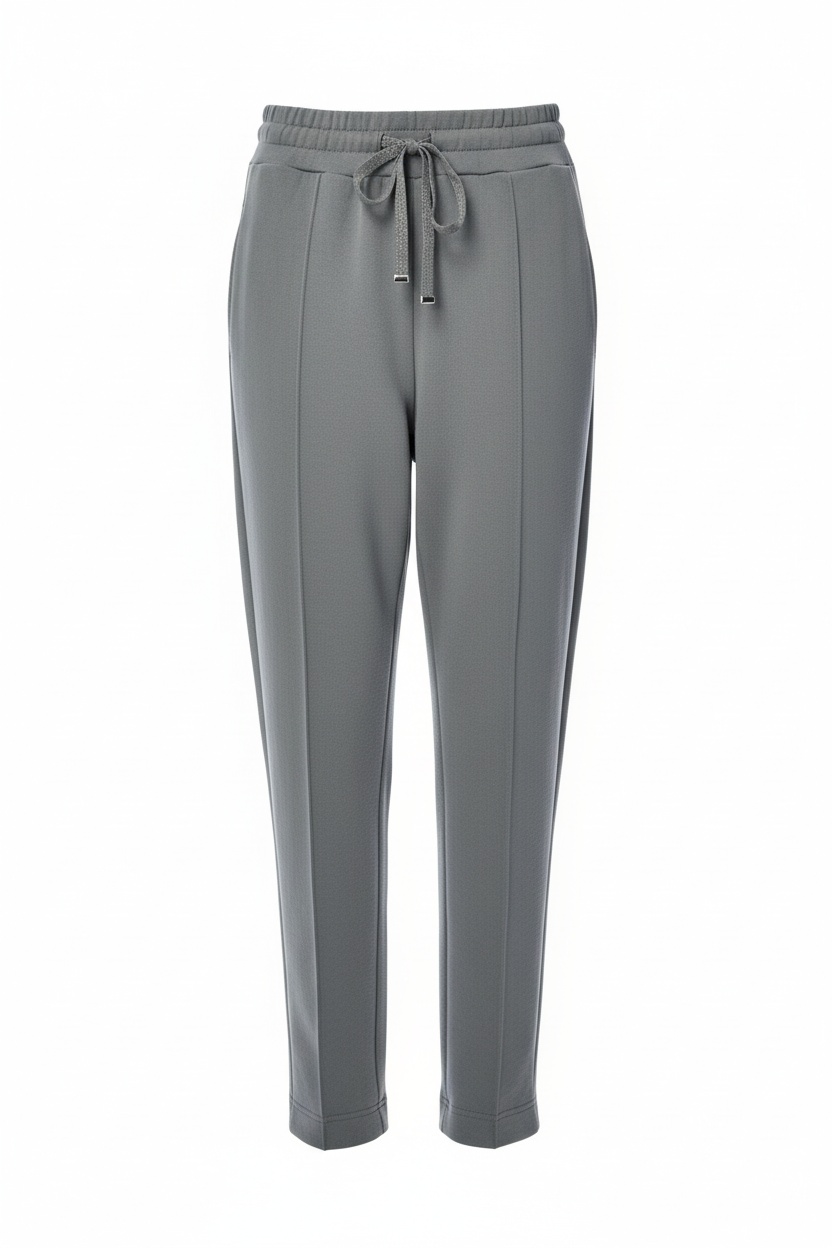 Костюм складається з джемперу та брюк у спортивному стилі. Джемпер має капюшон і декоративну в’язану вставку вздовж центральної частини та понизу. Рельєфні манжети й нижня планка додають образу завершеності, а делікатний логотип на краю — фірмового шарму. Сірі брюки з еластичним поясом і зав’язками створені для комфорту й щоденного стилю.