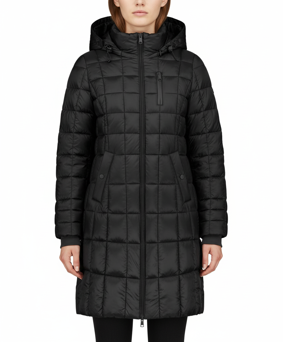 Виконане з стьобаної тканини у чорному кольорі, пальто має прямий силует і подовжену довжину, що забезпечує комфорт і захист у холодну погоду. Капюшон з куліскою додає функціональності та надійно захищає від вітру. Вертикальна застібка на блискавку з планкою створює лаконічний сучасний вигляд, а зручні кишені роблять пальто практичним у використанні.