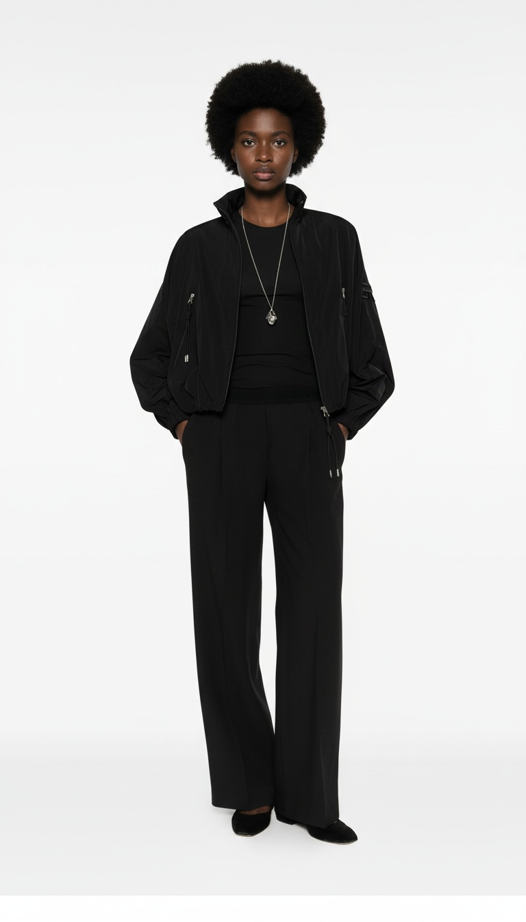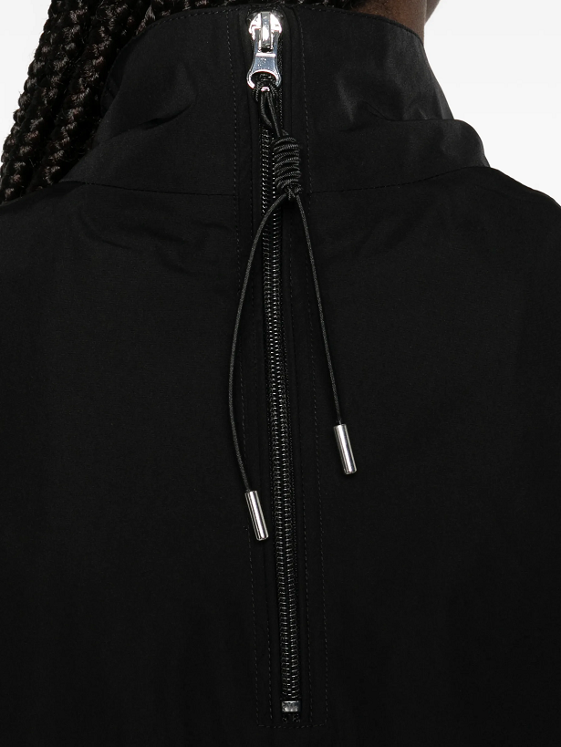 Куртка з технічної тканини з високим коміром і широким низом, зібраним за допомогою внутрішньої гумки. Рукави з еластичними манжетами та вертикальною блискавкою на задній частині коміра. Монограма на рукаві.