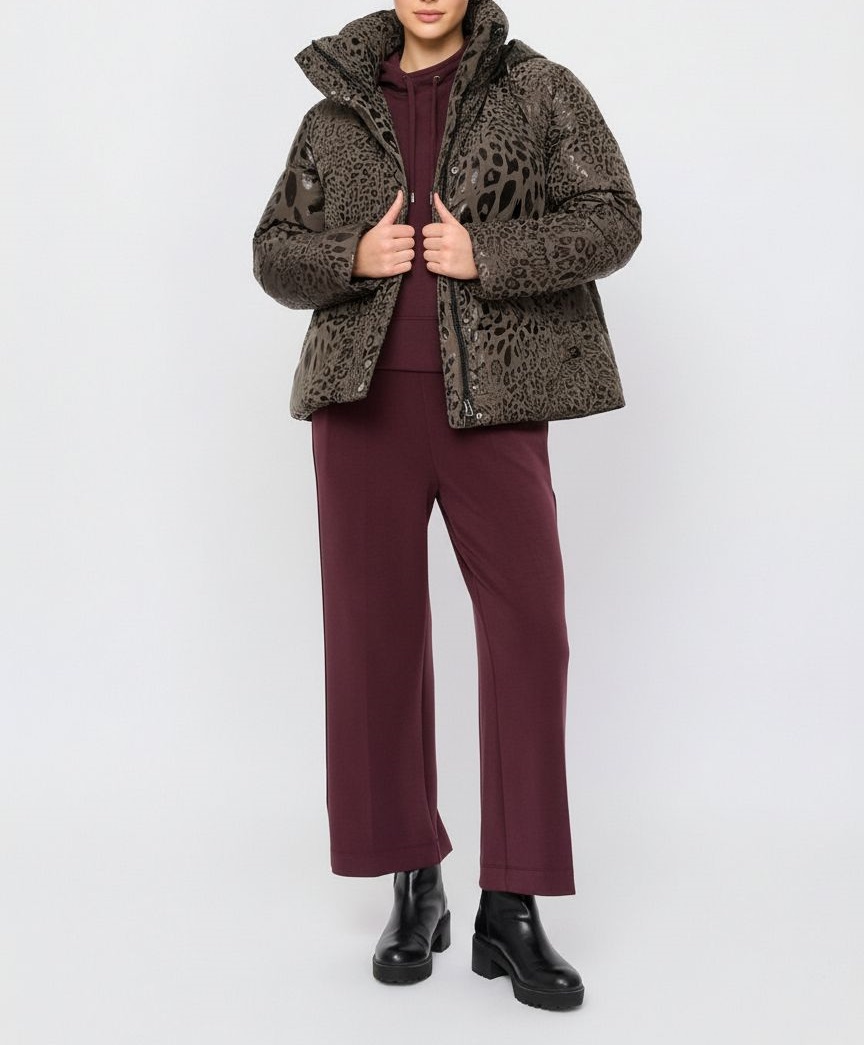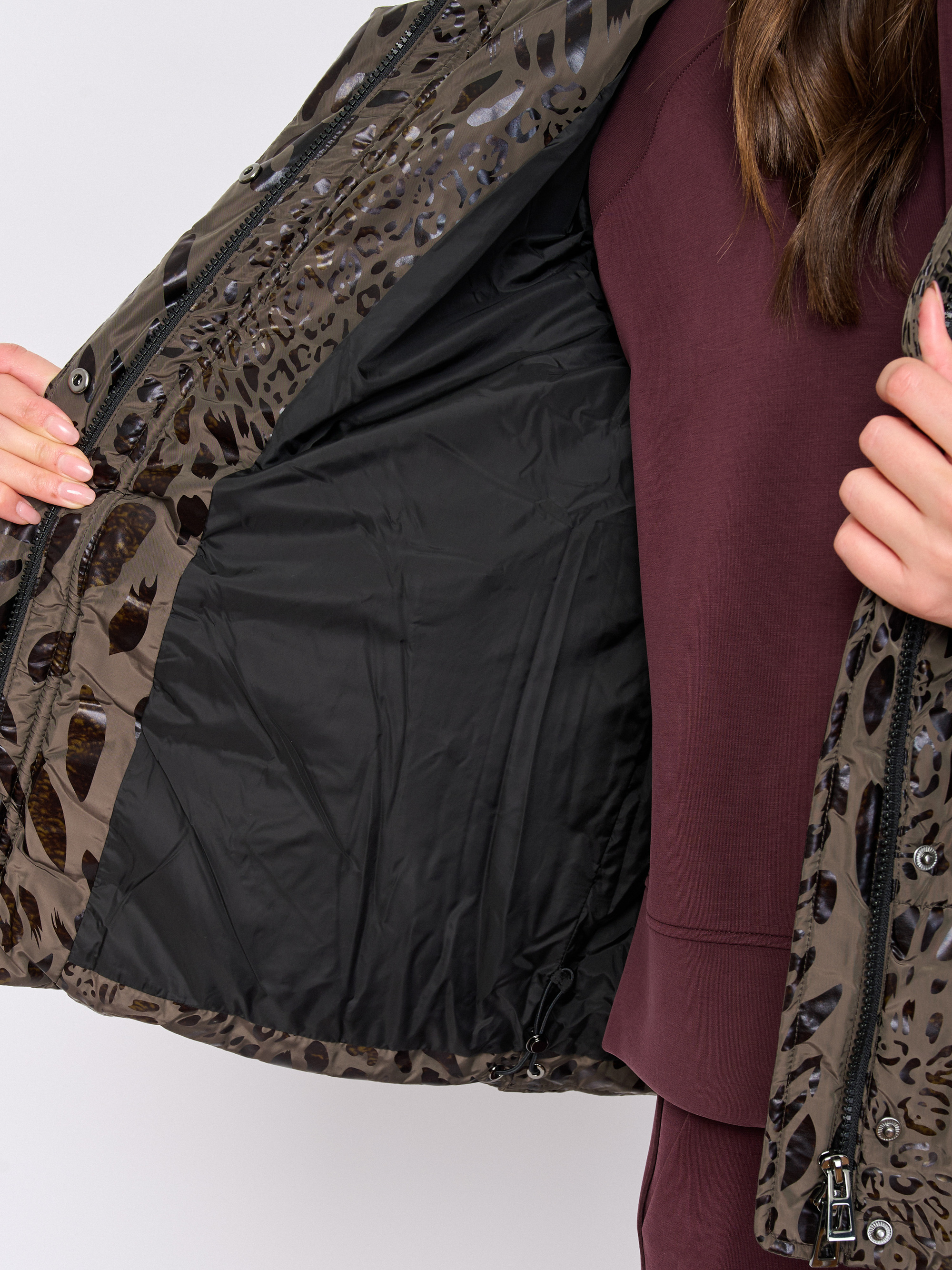 Модель виконана з глянцевим ефектом і декоративним абстрактним візерунком, що додає динаміки та виразності. Прямий силует із вертикальною застібкою на блискавку та кнопки поєднує практичність і елегантність. Високий комір-стойка та об’ємний капюшон забезпечують захист від вітру й холоду.