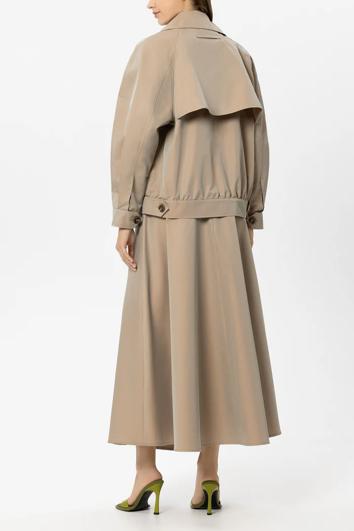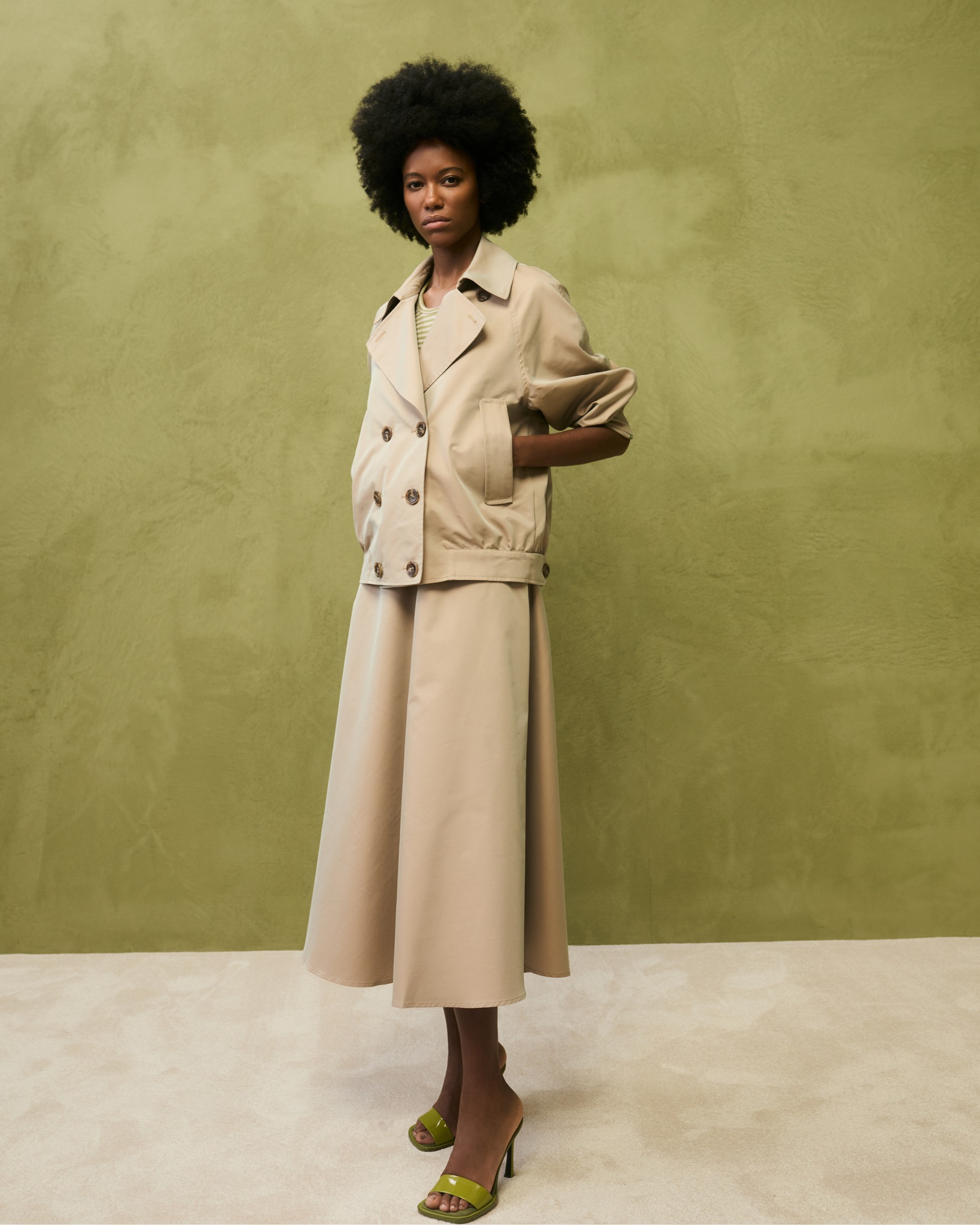 Сучасний блузон у стилі «тренч» прямого крою, виготовлений із вишуканої, злегка переливчастої бавовняної суміші для активного відпочинку. Модель має комір з широкими лацканами, двобортну застібку на ґудзиках та бічні кишені з розрізами.