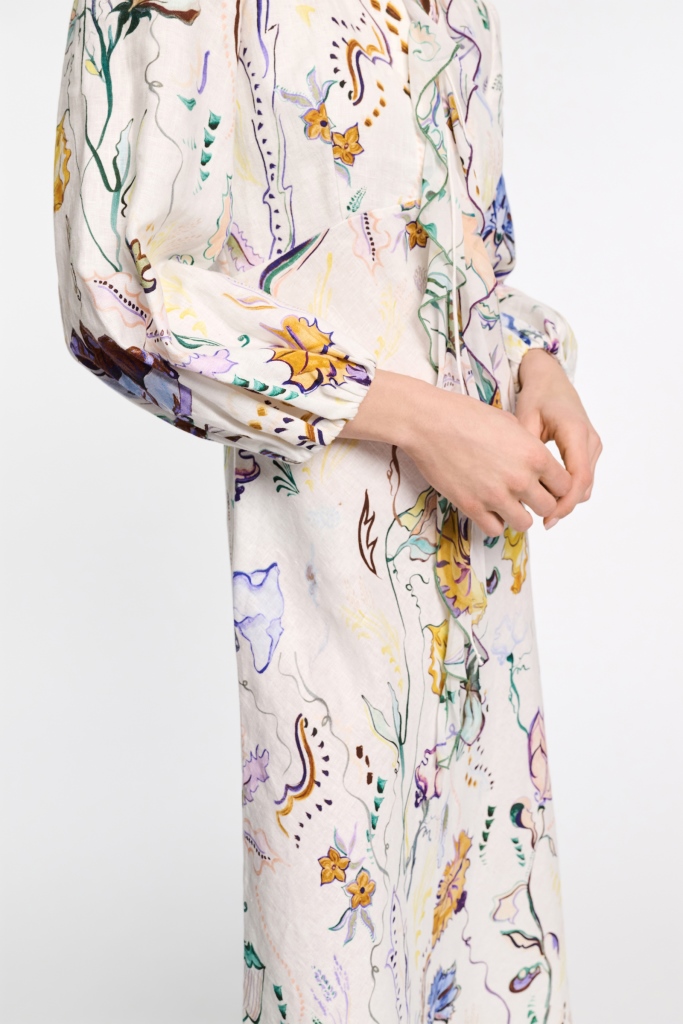 Лляна сукня міді з принтом, застібка на шнурівку та рюші з шовкового жоржету. Сукня має приталені манжети та пишну спідницю-гофре.