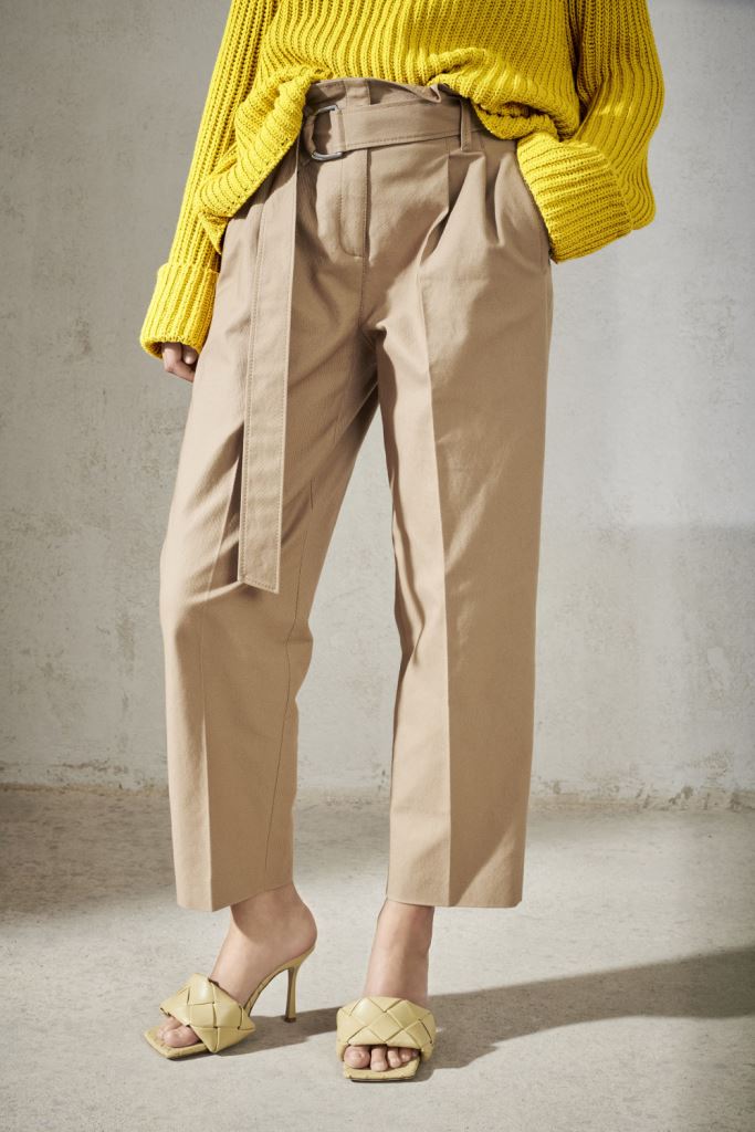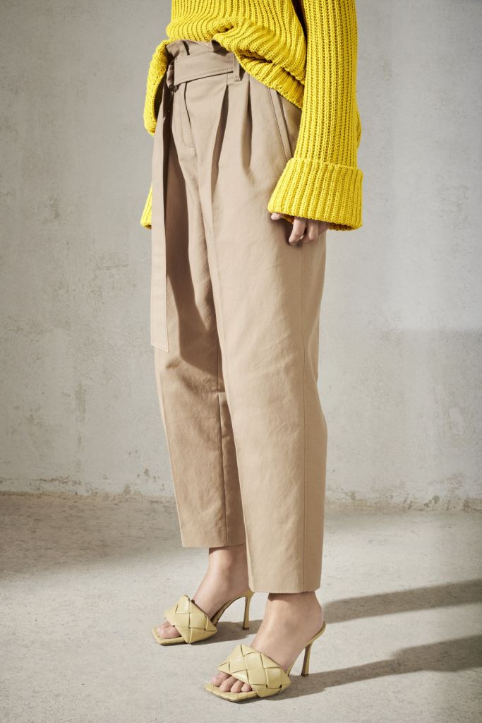 Брюки широкого крою з двома боковими кишенями та внутрішньою кишенею з клапаном. Тканинний ремінь з подвійною D-образною пряжкою підкреслює талію.