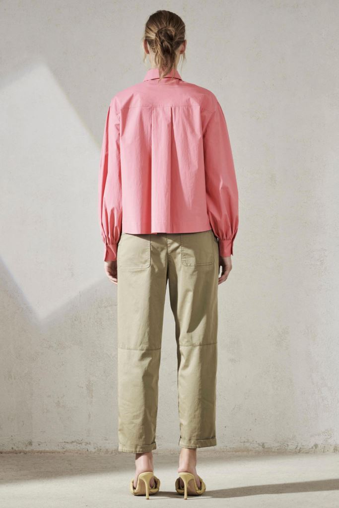 Укорочена блуза з тонкого еластичного попліну з класичним коміром, потайною планкою на ґудзиках з перламутровими ґудзиками і бічним розрізом по низу. Ефектні об'ємні рукави, які закінчуються широкими манжетами.