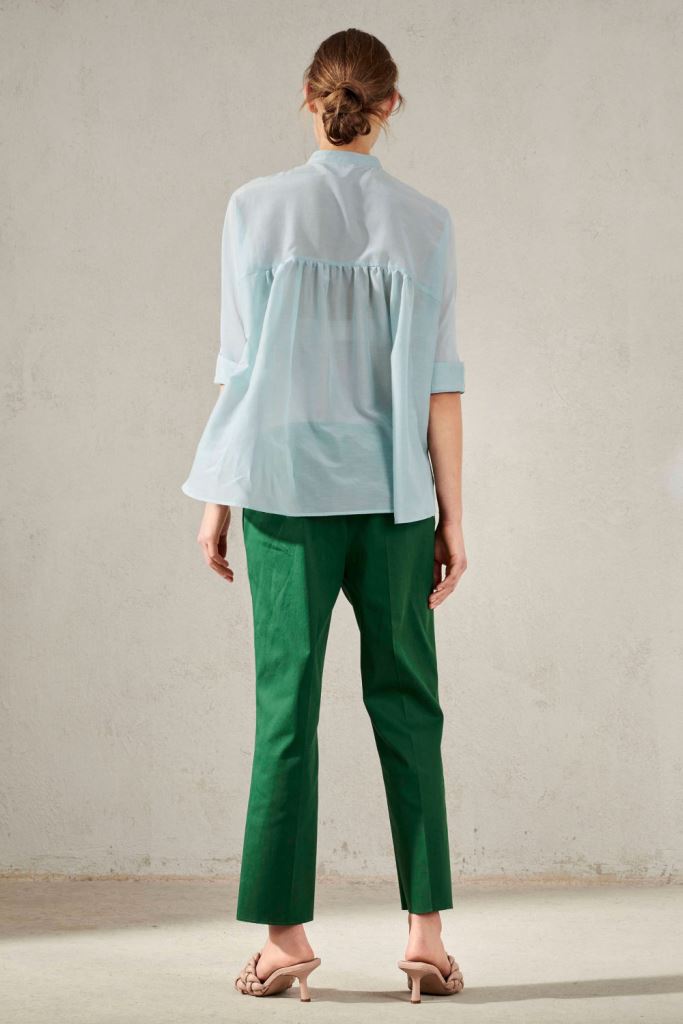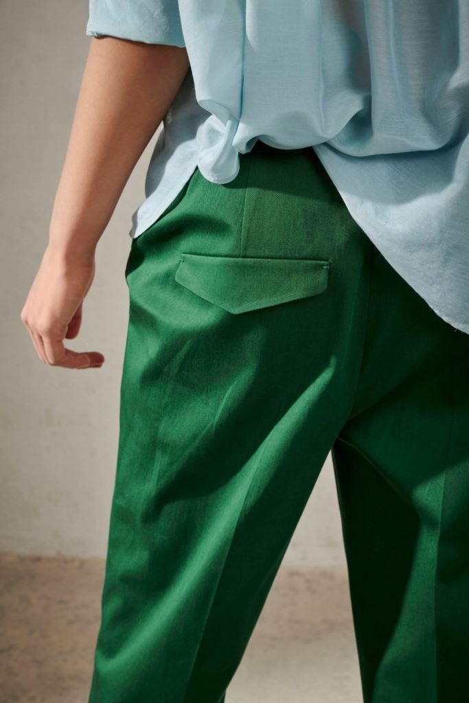 Укорочені розкльошені брюки з тонкої еластичної бавовни зі складками, двома боковими кишенями і двома накладними кишенями ззаду.