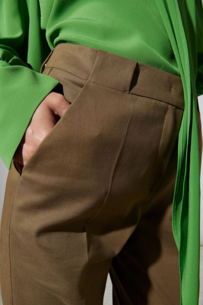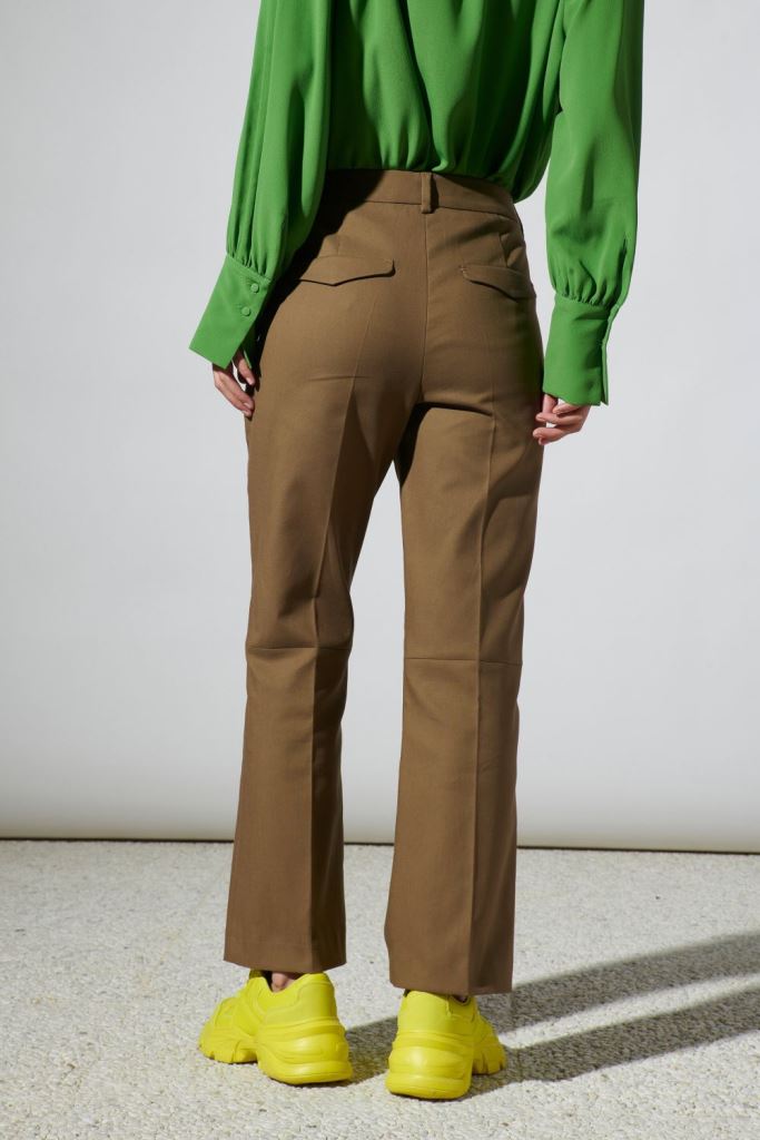 Брюки-кльош з сучасної бавовняної подвійної тканини зі стрейчем. Мають укорочений крій, широкі петлі для ременя та врізні задні кишені.