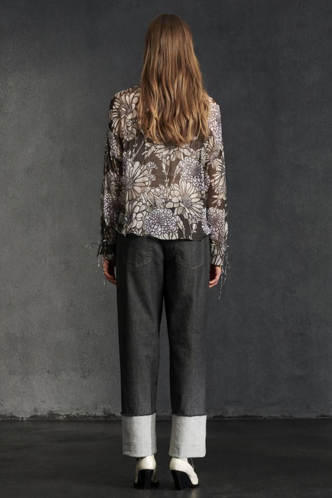 Ця блуза-сорочка виготовлена з чистої віскози. Модель вільного крою з квітковим візерунком, вузьким коміром-стійкою та вирізом у вигляді замкової щілини на гудзиках.