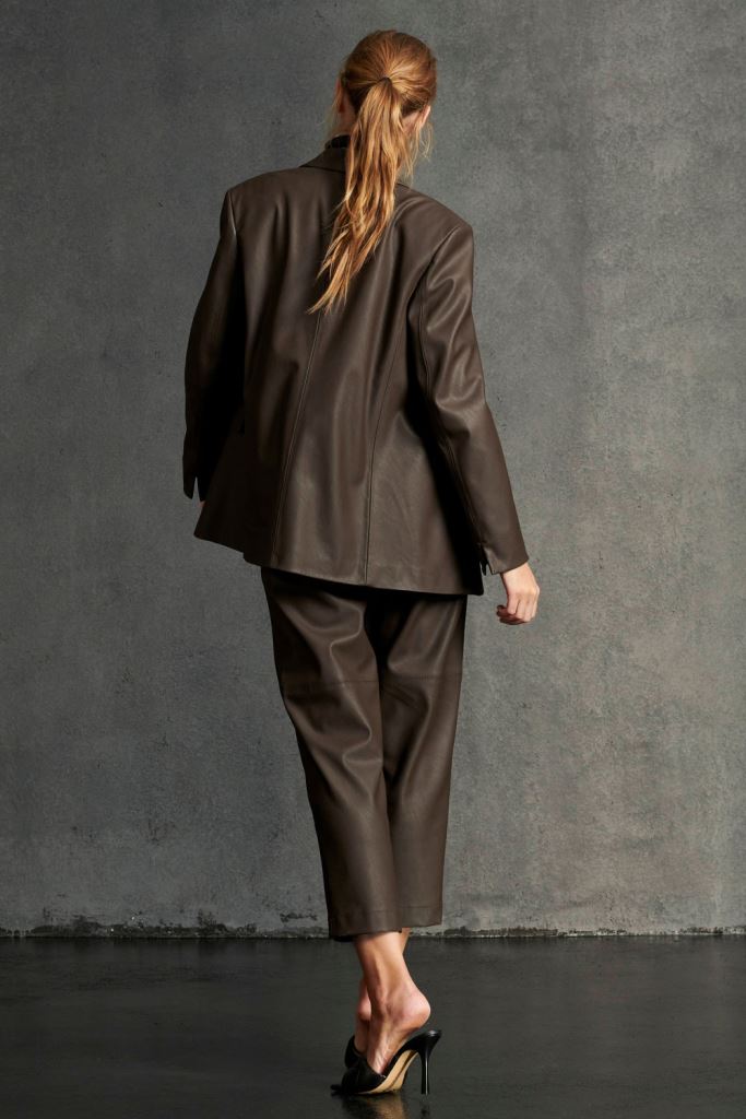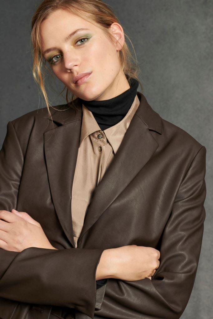 Жакет подовженого крою зі штучної шкіри. Застібається на два гудзики. Імітація кишень з клапанами попереду.