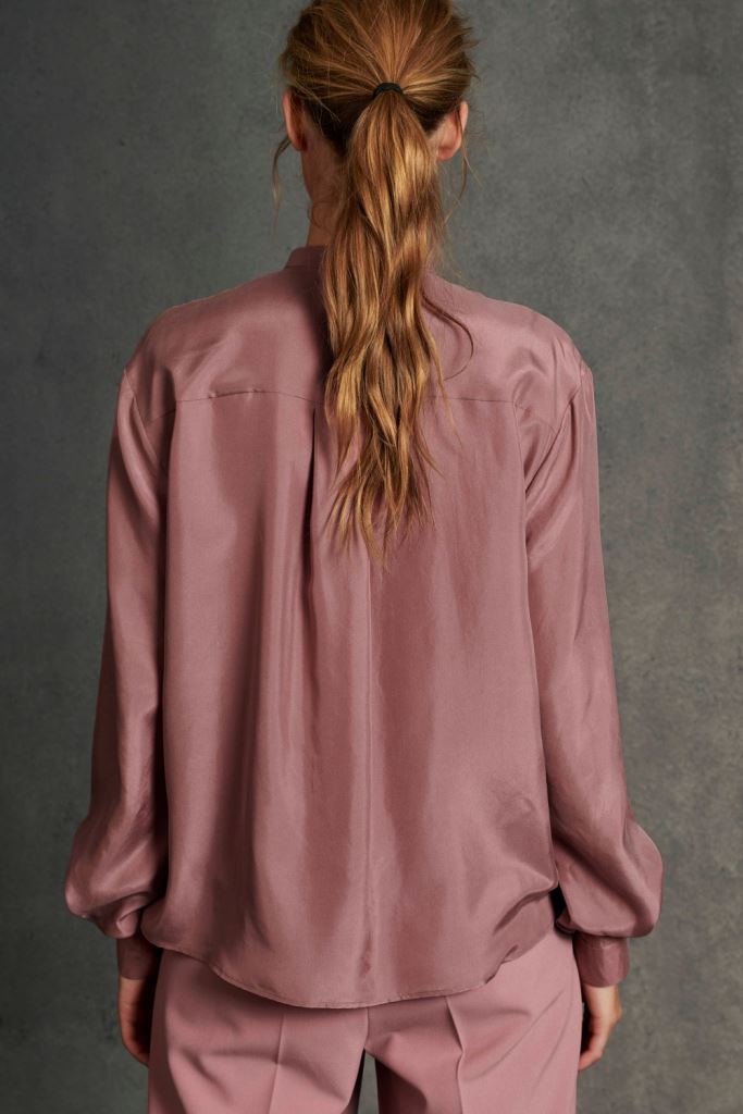 Блуза з довгими рукавами з чистого шовку з обробкою «сендвіч». Застібається на гудзики. Має злегка подовжену спинку.