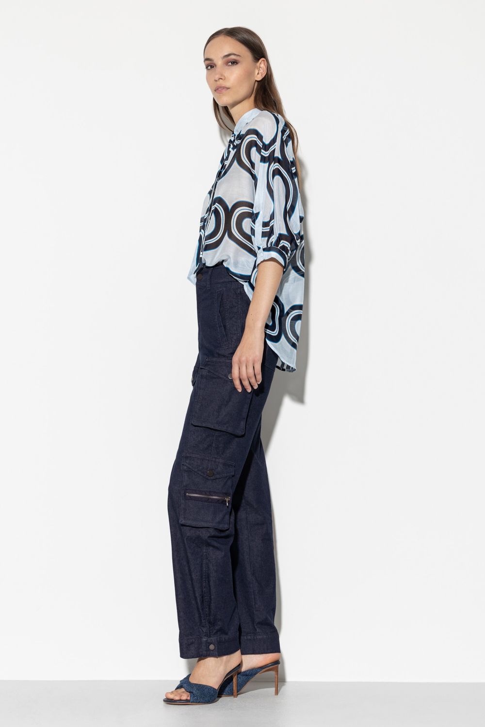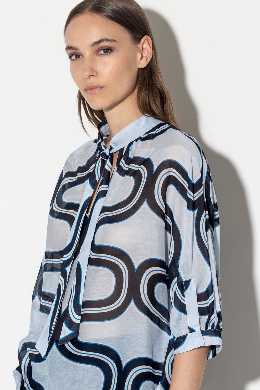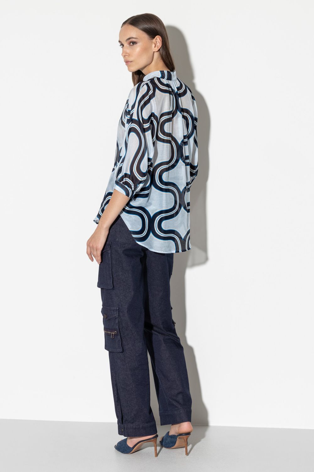 Прозора блуза-кімоно з тонкої бавовняно-шовкової вуалі з ексклюзивним графічним хвилеподібним принтом. Вільний крій. Напівокруглений поділ.