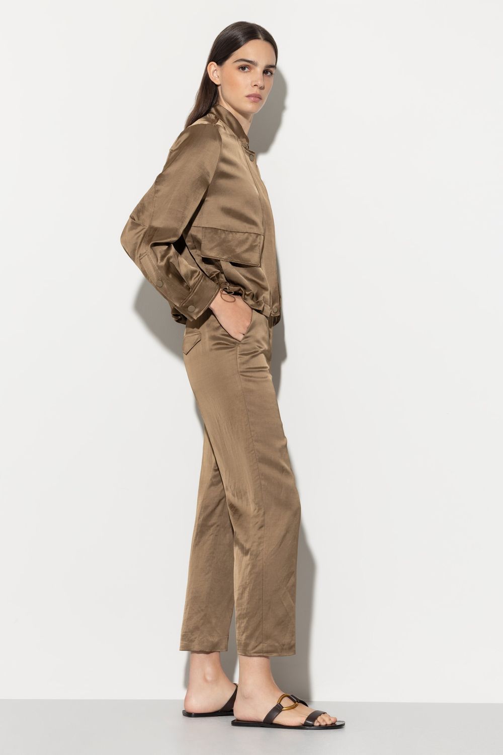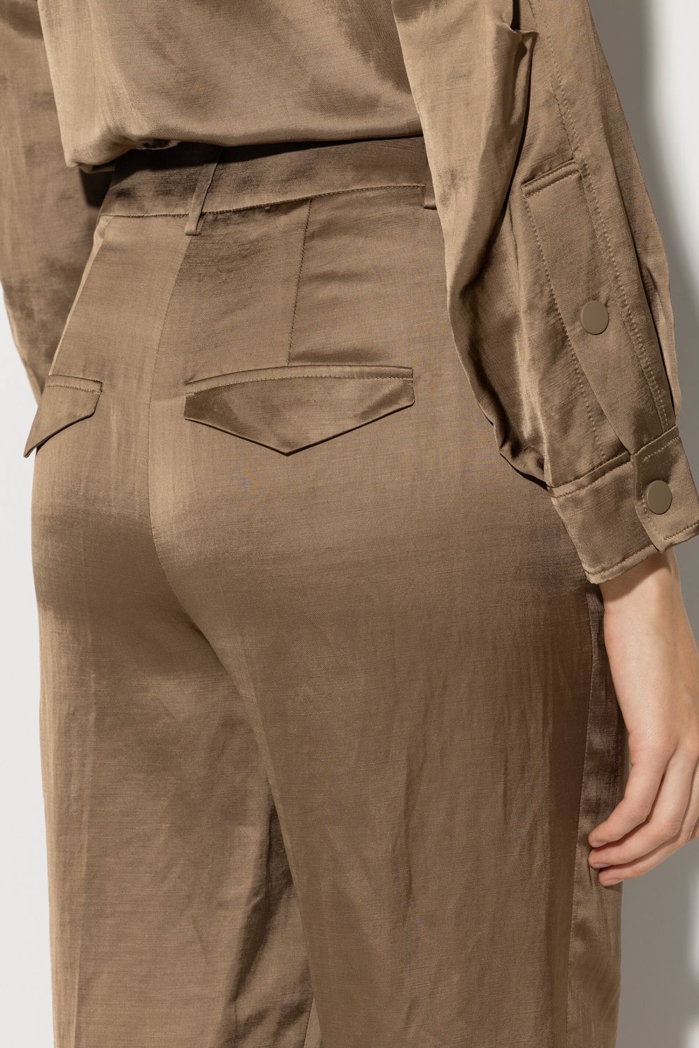Укорочені широкі брюки з блискучого атласу з класичними втиснутими складками. Мають дві бокові кишені та дві декоративні кишені з клапаном позаду.