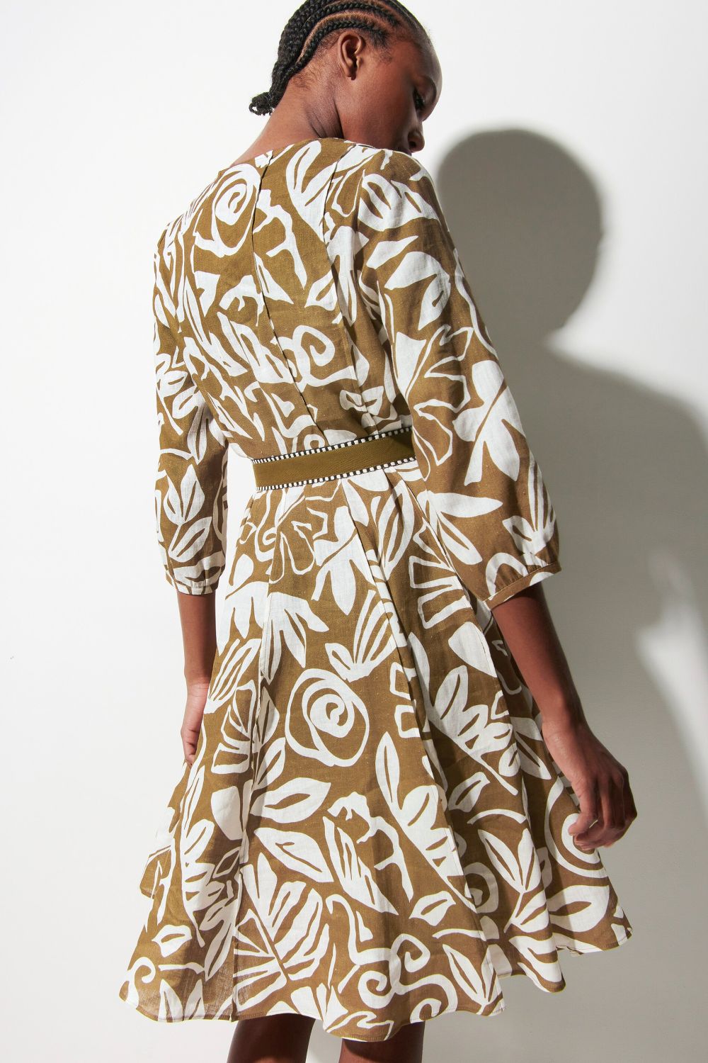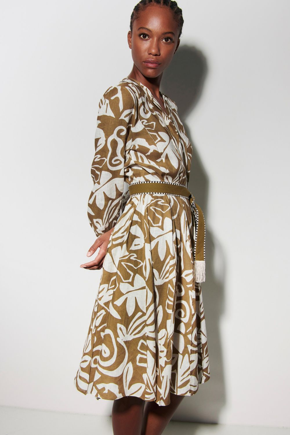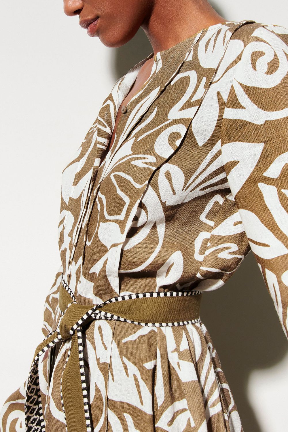 Сукня-сорочка з льону та віскози. Представлена з тканим поясом з бахромою, який створює індивідуальний приталений силует. Довжина нижче коліна.