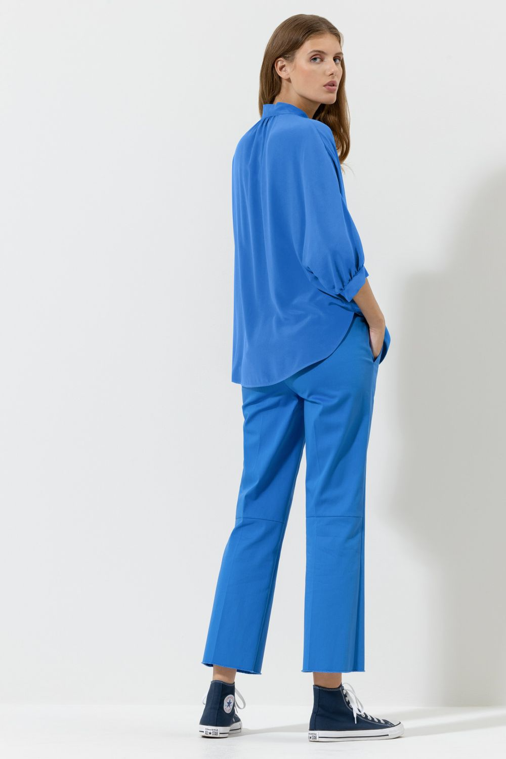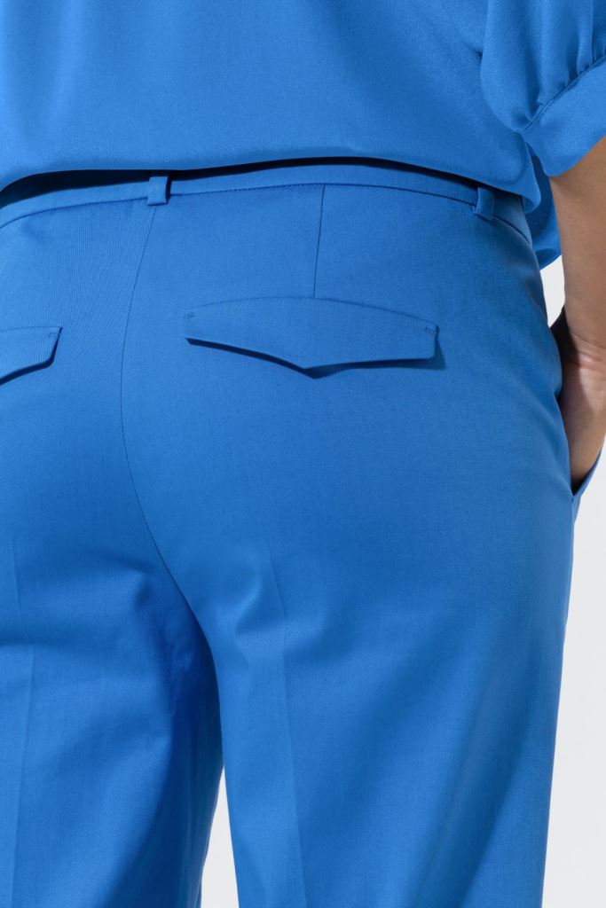 Габардинові брюки злегка укороченого крою з кльошем. Відкритий поділ додає невимушеності класичному дизайну.