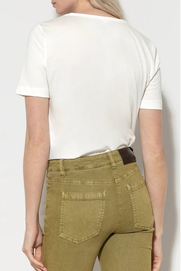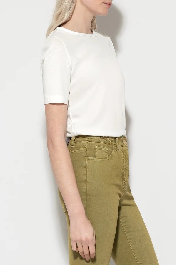 Футболка з міксу матеріалів з круглою горловиною, вузьким плечем і боковим розрізом по подолу. Спереду - струмливий шовковий мікс. Напівдовгі рукави та спинка виконані з трикотажного полотна.