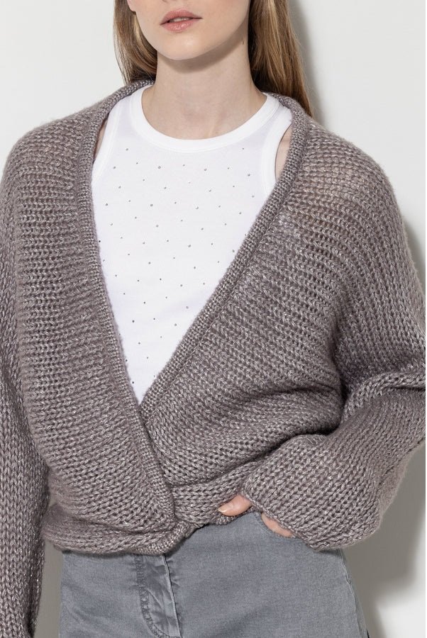 Кардиган відкритої в'язки з гламурної мерехтливої вовняної суміші з глибоким вирізом і широкими рукавами.